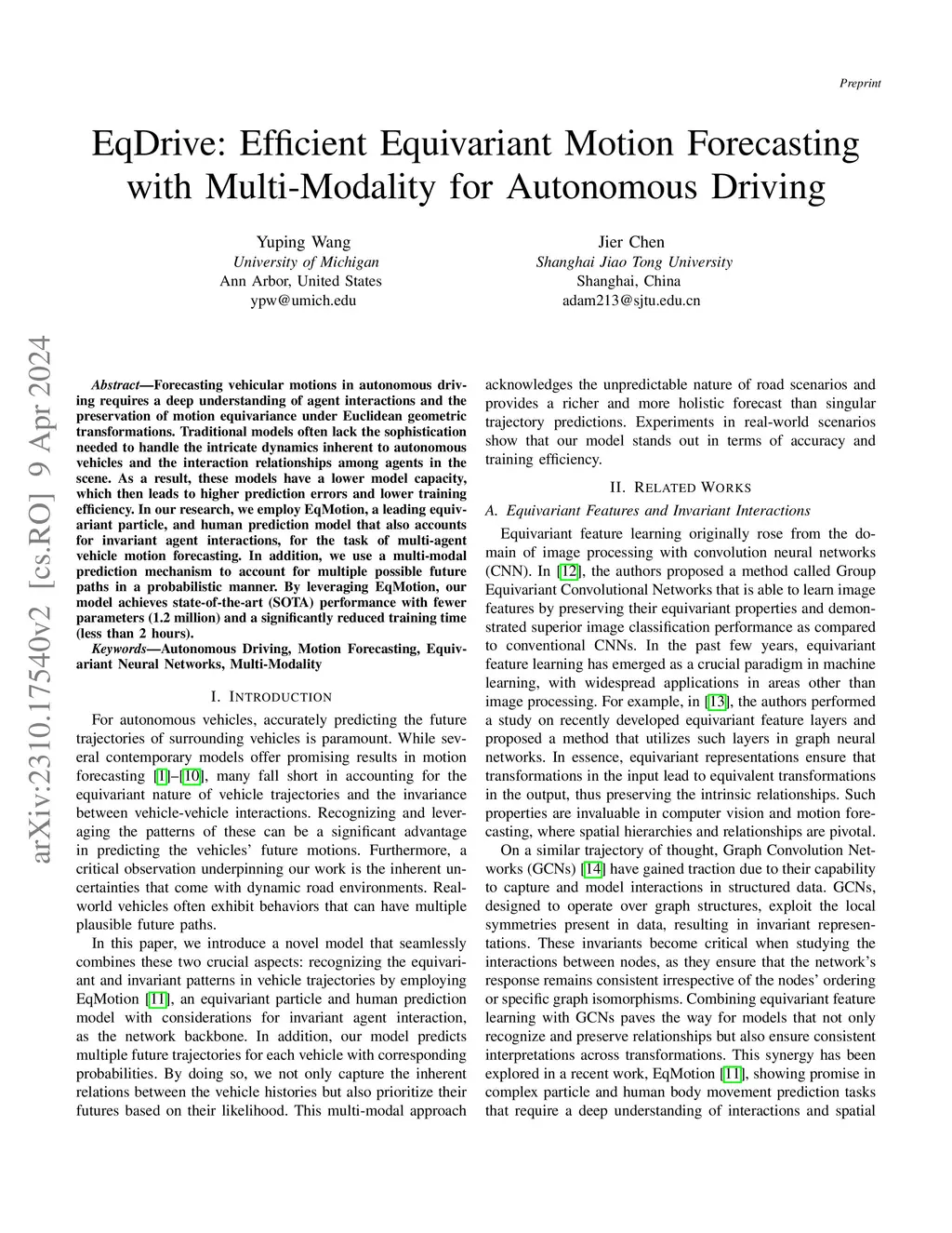 Forecasting vehicular motions in autonomous driving requires a deep understanding of agent interactions and the preservation of motion equivariance under Euclidean geometric transformations. Traditional models often lack the sophistication needed to handle the intricate dynamics inherent to autonomous vehicles and the interaction relationships among agents in the scene. As a result, these models have a lower model capacity, which then leads to higher prediction errors and lower training efficiency. In our research, we employ EqMotion, a leading equivariant particle, and human prediction model that also accounts for invariant agent interactions, for the task of multi-agent vehicle motion forecasting. In addition, we use a multi-modal prediction mechanism to account for multiple possible future paths in a probabilistic manner. By leveraging EqMotion, our model achieves state-of-the-art (SOTA) performance with fewer parameters (1.2 million) and a significantly reduced training time (less than 2 hours).
