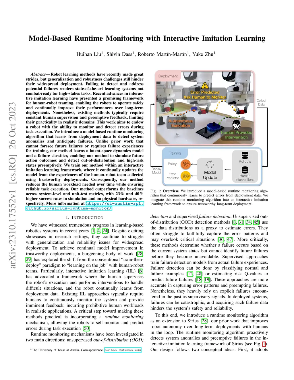 Robot learning methods have recently made great strides, but generalization and robustness challenges still hinder their widespread deployment. Failing to detect and address potential failures renders state-of-the-art learning systems not combat-ready for high-stakes tasks. Recent advances in interactive imitation learning have presented a promising framework for human-robot teaming, enabling the robots to operate safely and continually improve their performances over long-term deployments. Nonetheless, existing methods typically require constant human supervision and preemptive feedback, limiting their practicality in realistic domains. This work aims to endow a robot with the ability to monitor and detect errors during task execution. We introduce a model-based runtime monitoring algorithm that learns from deployment data to detect system anomalies and anticipate failures. Unlike prior work that cannot foresee future failures or requires failure experiences for training, our method learns a latent-space dynamics model and a failure classifier, enabling our method to simulate future action outcomes and detect out-of-distribution and high-risk states preemptively. We train our method within an interactive imitation learning framework, where it continually updates the model from the experiences of the human-robot team collected using trustworthy deployments. Consequently, our method reduces the human workload needed over time while ensuring reliable task execution. Our method outperforms the baselines across system-level and unit-test metrics, with 23% and 40% higher success rates in simulation and on physical hardware, respectively. More information at https://ut-austin-rpl.github.io/sirius-runtime-monitor/
