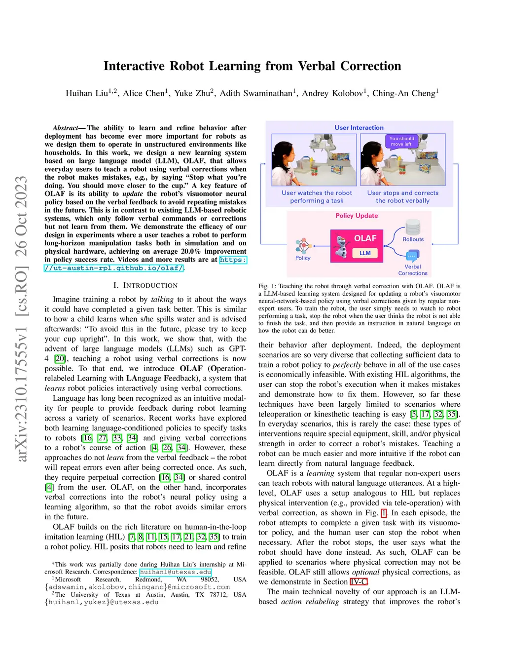 The ability to learn and refine behavior after deployment has become ever more important for robots as we design them to operate in unstructured environments like households. In this work, we design a new learning system based on large language model (LLM), OLAF, that allows everyday users to teach a robot using verbal corrections when the robot makes mistakes, e.g., by saying "Stop what you're doing. You should move closer to the cup." A key feature of OLAF is its ability to update the robot's visuomotor neural policy based on the verbal feedback to avoid repeating mistakes in the future. This is in contrast to existing LLM-based robotic systems, which only follow verbal commands or corrections but not learn from them. We demonstrate the efficacy of our design in experiments where a user teaches a robot to perform long-horizon manipulation tasks both in simulation and on physical hardware, achieving on average 20.0% improvement in policy success rate. Videos and more results are at https://ut-austin-rpl.github.io/olaf/