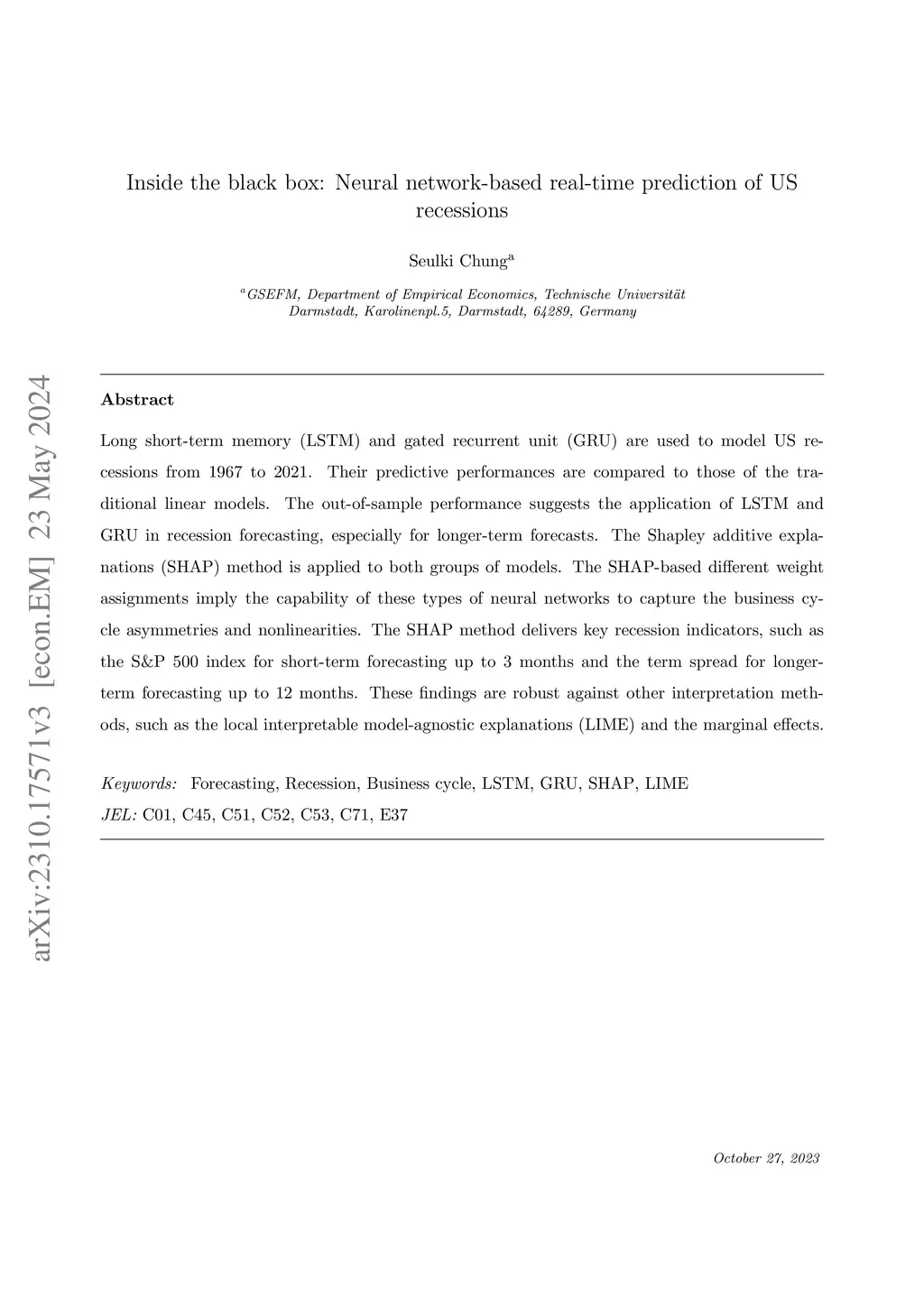 Long short-term memory (LSTM) and gated recurrent unit (GRU) are used to model US recessions from 1967 to 2021. Their predictive performances are compared to those of the traditional linear models. The out-of-sample performance suggests the application of LSTM and GRU in recession forecasting, especially for longer-term forecasts. The Shapley additive explanations (SHAP) method is applied to both groups of models. The SHAP-based different weight assignments imply the capability of these types of neural networks to capture the business cycle asymmetries and nonlinearities. The SHAP method delivers key recession indicators, such as the S&P 500 index for short-term forecasting up to 3 months and the term spread for longer-term forecasting up to 12 months. These findings are robust against other interpretation methods, such as the local interpretable model-agnostic explanations (LIME) and the marginal effects.