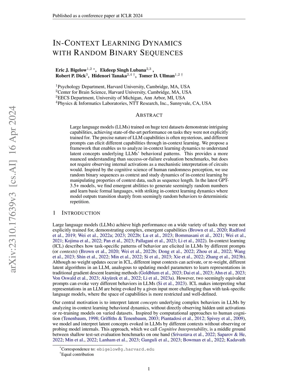Large language models (LLMs) trained on huge corpora of text datasets demonstrate intriguing capabilities, achieving state-of-the-art performance on tasks they were not explicitly trained for. The precise nature of LLM capabilities is often mysterious, and different prompts can elicit different capabilities through in-context learning. We propose a framework that enables us to analyze in-context learning dynamics to understand latent concepts underlying LLMs' behavioral patterns. This provides a more nuanced understanding than success-or-failure evaluation benchmarks, but does not require observing internal activations as a mechanistic interpretation of circuits would. Inspired by the cognitive science of human randomness perception, we use random binary sequences as context and study dynamics of in-context learning by manipulating properties of context data, such as sequence length. In the latest GPT-3.5+ models, we find emergent abilities to generate seemingly random numbers and learn basic formal languages, with striking in-context learning dynamics where model outputs transition sharply from seemingly random behaviors to deterministic repetition.