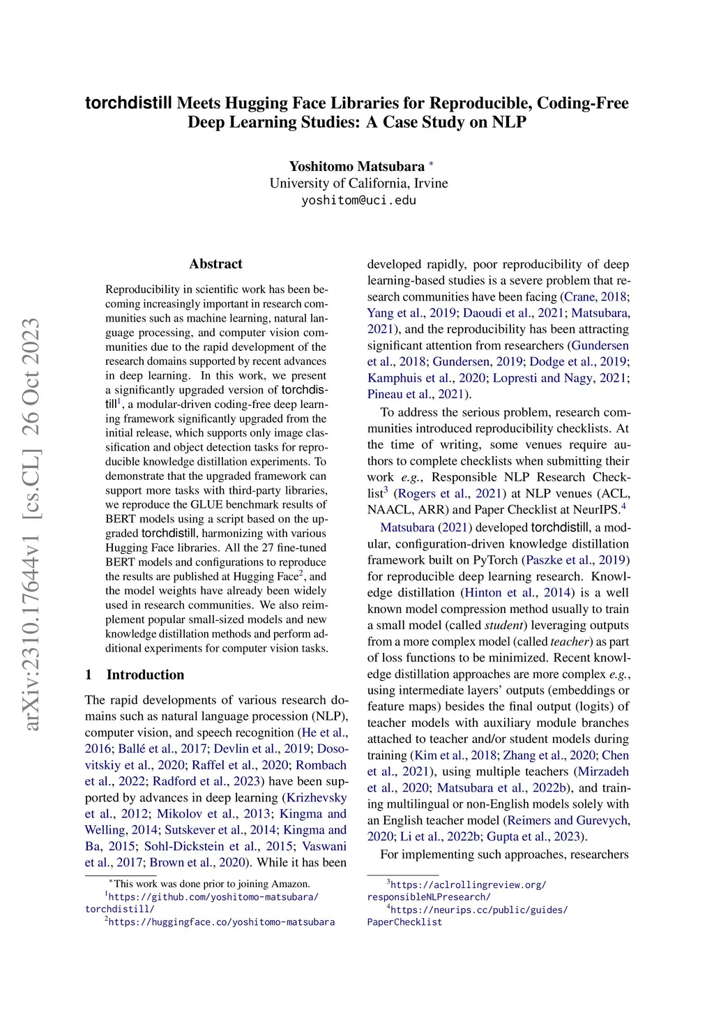 Reproducibility in scientific work has been becoming increasingly important in research communities such as machine learning, natural language processing, and computer vision communities due to the rapid development of the research domains supported by recent advances in deep learning. In this work, we present a significantly upgraded version of torchdistill, a modular-driven coding-free deep learning framework significantly upgraded from the initial release, which supports only image classification and object detection tasks for reproducible knowledge distillation experiments. To demonstrate that the upgraded framework can support more tasks with third-party libraries, we reproduce the GLUE benchmark results of BERT models using a script based on the upgraded torchdistill, harmonizing with various Hugging Face libraries. All the 27 fine-tuned BERT models and configurations to reproduce the results are published at Hugging Face, and the model weights have already been widely used in research communities. We also reimplement popular small-sized models and new knowledge distillation methods and perform additional experiments for computer vision tasks.