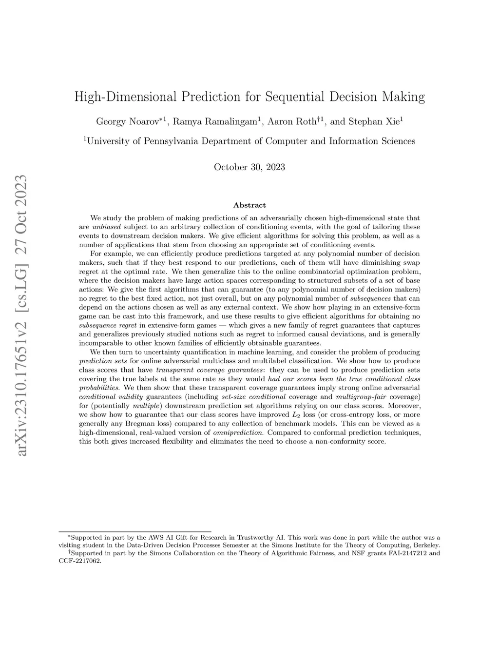 We study the problem of making predictions of an adversarially chosen high-dimensional state that are unbiased subject to an arbitrary collection of conditioning events, with the goal of tailoring these events to downstream decision makers. We give efficient algorithms for solving this problem, as well as a number of applications that stem from choosing an appropriate set of conditioning events. For example, we can efficiently make predictions targeted at polynomially many decision makers, giving each of them optimal swap regret if they best-respond to our predictions. We generalize this to online combinatorial optimization, where the decision makers have a very large action space, to give the first algorithms offering polynomially many decision makers no regret on polynomially many subsequences that may depend on their actions and the context. We apply these results to get efficient no-subsequence-regret algorithms in extensive-form games (EFGs), yielding a new family of regret guarantees for EFGs that generalizes some existing EFG regret notions, e.g. regret to informed causal deviations, and is generally incomparable to other known such notions. Next, we develop a novel transparent alternative to conformal prediction for building valid online adversarial multiclass prediction sets. We produce class scores that downstream algorithms can use for producing valid-coverage prediction sets, as if these scores were the true conditional class probabilities. We show this implies strong conditional validity guarantees including set-size-conditional and multigroup-fair coverage for polynomially many downstream prediction sets. Moreover, our class scores can be guaranteed to have improved loss, cross-entropy loss, and generally any Bregman loss, compared to any collection of benchmark models, yielding a high-dimensional real-valued version of omniprediction.