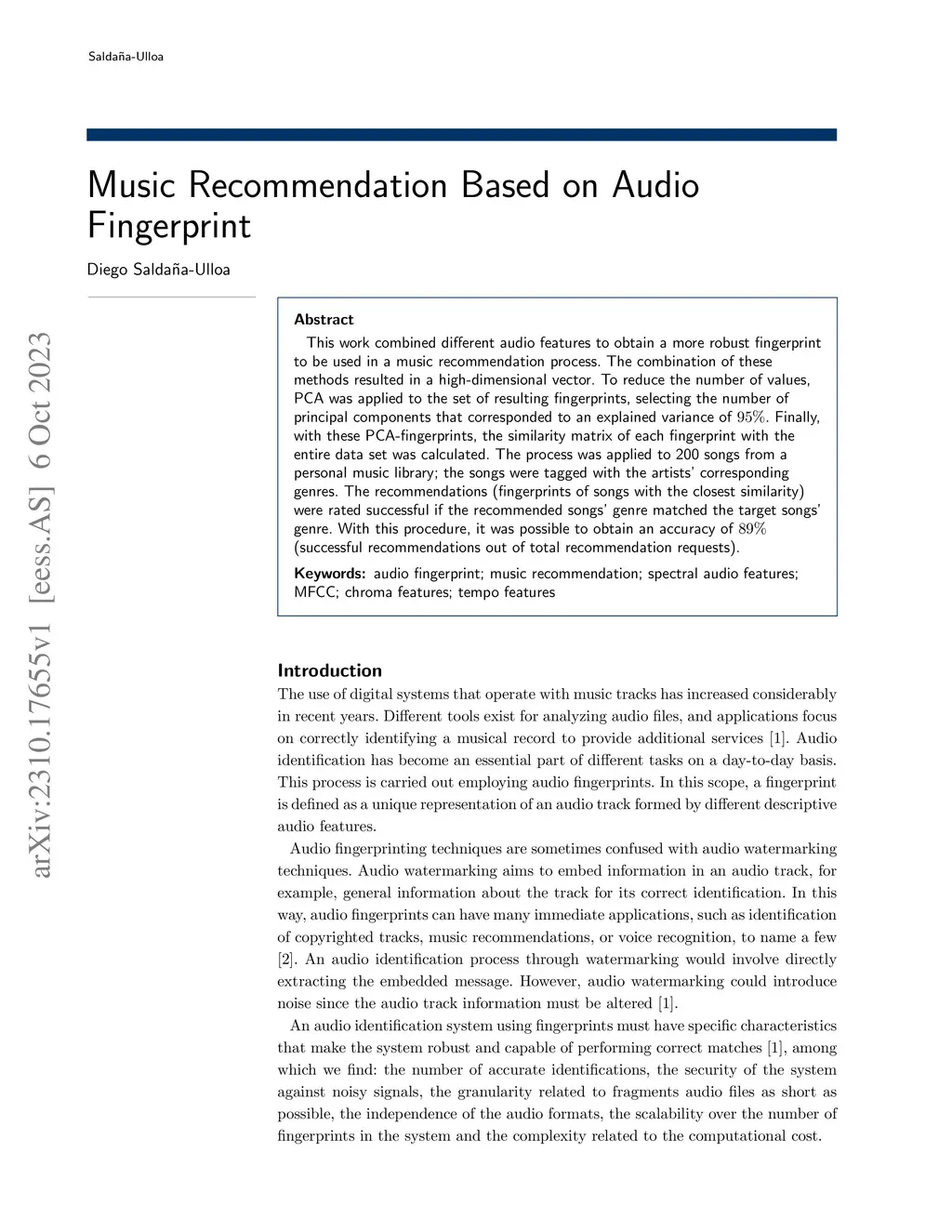 This work combined different audio features to obtain a more robust fingerprint to be used in a music recommendation process. The combination of these methods resulted in a high-dimensional vector. To reduce the number of values, PCA was applied to the set of resulting fingerprints, selecting the number of principal components that corresponded to an explained variance of . Finally, with these PCA-fingerprints, the similarity matrix of each fingerprint with the entire data set was calculated. The process was applied to 200 songs from a personal music library; the songs were tagged with the artists' corresponding genres. The recommendations (fingerprints of songs with the closest similarity) were rated successful if the recommended songs' genre matched the target songs' genre. With this procedure, it was possible to obtain an accuracy of (successful recommendations out of total recommendation requests).