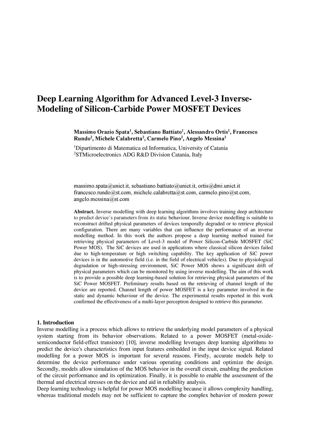 Inverse modelling with deep learning algorithms involves training deep architecture to predict device's parameters from its static behaviour. Inverse device modelling is suitable to reconstruct drifted physical parameters of devices temporally degraded or to retrieve physical configuration. There are many variables that can influence the performance of an inverse modelling method. In this work the authors propose a deep learning method trained for retrieving physical parameters of Level-3 model of Power Silicon-Carbide MOSFET (SiC Power MOS). The SiC devices are used in applications where classical silicon devices failed due to high-temperature or high switching capability. The key application of SiC power devices is in the automotive field (i.e. in the field of electrical vehicles). Due to physiological degradation or high-stressing environment, SiC Power MOS shows a significant drift of physical parameters which can be monitored by using inverse modelling. The aim of this work is to provide a possible deep learning-based solution for retrieving physical parameters of the SiC Power MOSFET. Preliminary results based on the retrieving of channel length of the device are reported. Channel length of power MOSFET is a key parameter involved in the static and dynamic behaviour of the device. The experimental results reported in this work confirmed the effectiveness of a multi-layer perceptron designed to retrieve this parameter.