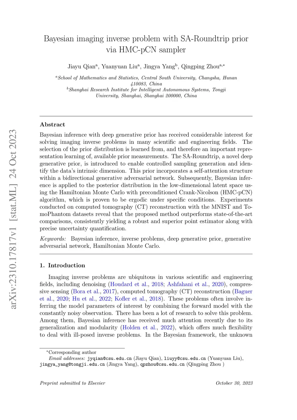 Bayesian inference with deep generative prior has received considerable interest for solving imaging inverse problems in many scientific and engineering fields. The selection of the prior distribution is learned from, and therefore an important representation learning of, available prior measurements. The SA-Roundtrip, a novel deep generative prior, is introduced to enable controlled sampling generation and identify the data's intrinsic dimension. This prior incorporates a self-attention structure within a bidirectional generative adversarial network. Subsequently, Bayesian inference is applied to the posterior distribution in the low-dimensional latent space using the Hamiltonian Monte Carlo with preconditioned Crank-Nicolson (HMC-pCN) algorithm, which is proven to be ergodic under specific conditions. Experiments conducted on computed tomography (CT) reconstruction with the MNIST and TomoPhantom datasets reveal that the proposed method outperforms state-of-the-art comparisons, consistently yielding a robust and superior point estimator along with precise uncertainty quantification.