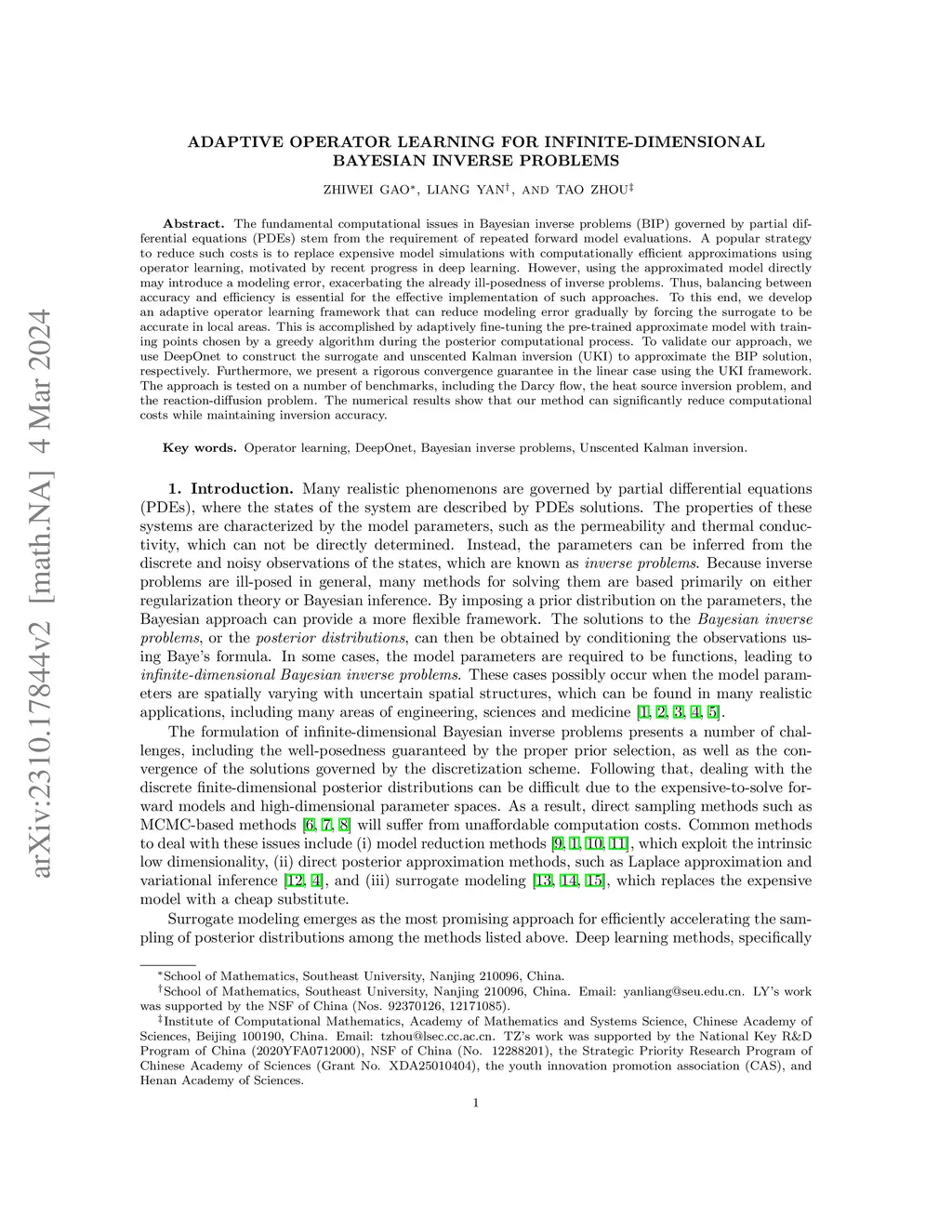 The fundamental computational issues in Bayesian inverse problems (BIP) governed by partial differential equations (PDEs) stem from the requirement of repeated forward model evaluations. A popular strategy to reduce such costs is to replace expensive model simulations with computationally efficient approximations using operator learning, motivated by recent progress in deep learning. However, using the approximated model directly may introduce a modeling error, exacerbating the already ill-posedness of inverse problems. Thus, balancing between accuracy and efficiency is essential for the effective implementation of such approaches. To this end, we develop an adaptive operator learning framework that can reduce modeling error gradually by forcing the surrogate to be accurate in local areas. This is accomplished by adaptively fine-tuning the pre-trained approximate model with train- ing points chosen by a greedy algorithm during the posterior computational process. To validate our approach, we use DeepOnet to construct the surrogate and unscented Kalman inversion (UKI) to approximate the BIP solution, respectively. Furthermore, we present a rigorous convergence guarantee in the linear case using the UKI framework. The approach is tested on a number of benchmarks, including the Darcy flow, the heat source inversion problem, and the reaction-diffusion problem. The numerical results show that our method can significantly reduce computational costs while maintaining inversion accuracy.