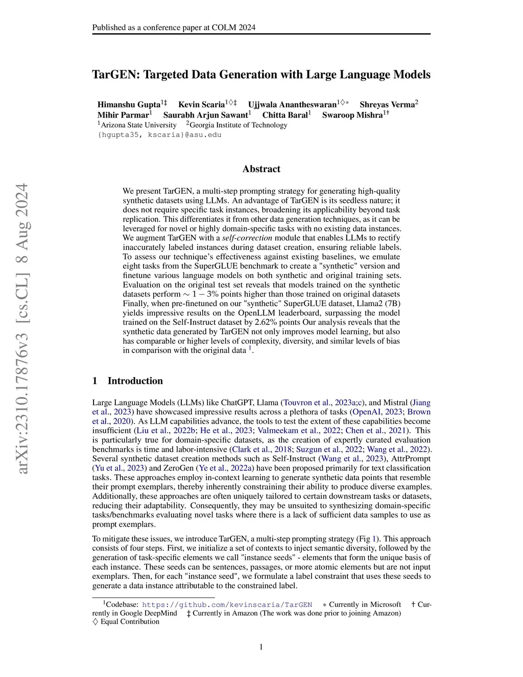 The rapid advancement of large language models (LLMs) has sparked interest in data synthesis techniques, aiming to generate diverse and high-quality synthetic datasets. However, these synthetic datasets often suffer from a lack of diversity and added noise. In this paper, we present TarGEN, a multi-step prompting strategy for generating high-quality synthetic datasets utilizing a LLM. An advantage of TarGEN is its seedless nature; it does not require specific task instances, broadening its applicability beyond task replication. We augment TarGEN with a method known as self-correction empowering LLMs to rectify inaccurately labeled instances during dataset creation, ensuring reliable labels. To assess our technique's effectiveness, we emulate 8 tasks from the SuperGLUE benchmark and finetune various language models, including encoder-only, encoder-decoder, and decoder-only models on both synthetic and original training sets. Evaluation on the original test set reveals that models trained on datasets generated by TarGEN perform approximately 1-2% points better than those trained on original datasets (82.84% via syn. vs. 81.12% on og. using Flan-T5). When incorporating instruction tuning, the performance increases to 84.54% on synthetic data vs. 81.49% on original data by Flan-T5. A comprehensive analysis of the synthetic dataset compared to the original dataset reveals that the synthetic dataset demonstrates similar or higher levels of dataset complexity and diversity. Furthermore, the synthetic dataset displays a bias level that aligns closely with the original dataset. Finally, when pre-finetuned on our synthetic SuperGLUE dataset, T5-3B yields impressive results on the OpenLLM leaderboard, surpassing the model trained on the Self-Instruct dataset by 4.14% points. We hope that TarGEN can be helpful for quality data generation and reducing the human efforts to create complex benchmarks.