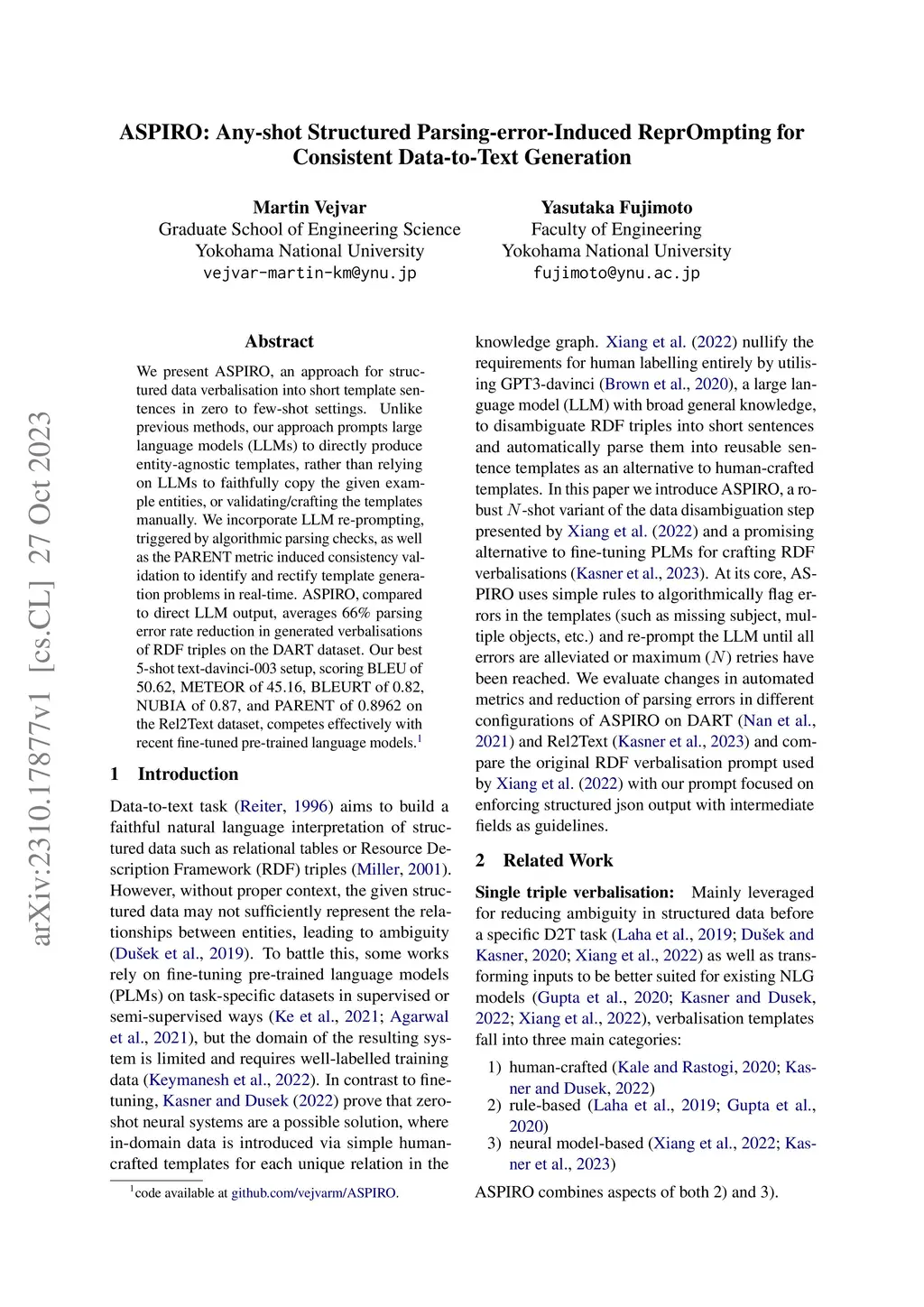 We present ASPIRO, an approach for structured data verbalisation into short template sentences in zero to few-shot settings. Unlike previous methods, our approach prompts large language models (LLMs) to directly produce entity-agnostic templates, rather than relying on LLMs to faithfully copy the given example entities, or validating/crafting the templates manually. We incorporate LLM re-prompting, triggered by algorithmic parsing checks, as well as the PARENT metric induced consistency validation to identify and rectify template generation problems in real-time. ASPIRO, compared to direct LLM output, averages 66\% parsing error rate reduction in generated verbalisations of RDF triples on the DART dataset. Our best 5-shot text-davinci-003 setup, scoring BLEU of 50.62, METEOR of 45.16, BLEURT of 0.82, NUBIA of 0.87, and PARENT of 0.8962 on the Rel2Text dataset, competes effectively with recent fine-tuned pre-trained language models.