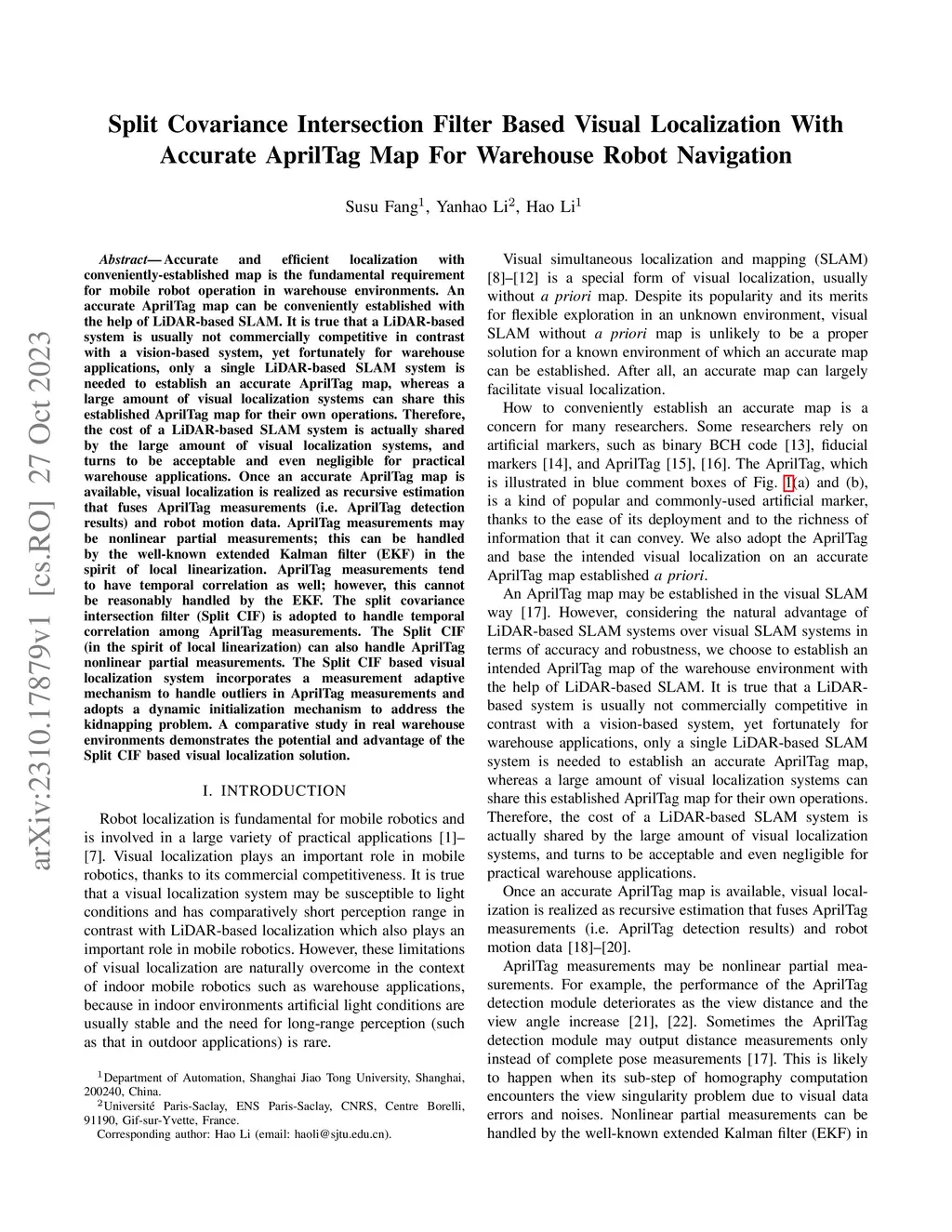 Split Covariance Intersection Filter Based Visual Localization With Accurate AprilTag Map For Warehouse Robot Navigation