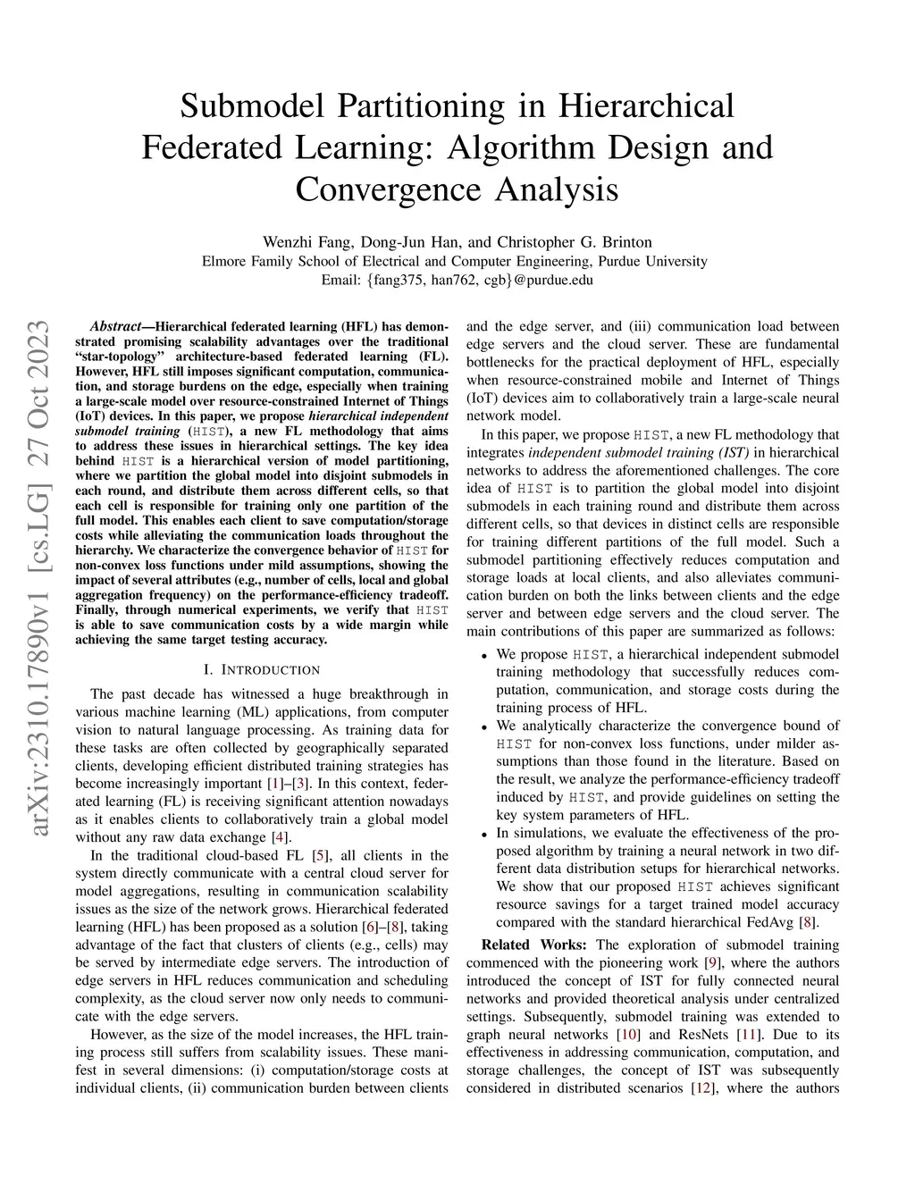 Hierarchical federated learning (HFL) has demonstrated promising scalability advantages over the traditional "star-topology" architecture-based federated learning (FL). However, HFL still imposes significant computation, communication, and storage burdens on the edge, especially when training a large-scale model over resource-constrained wireless devices. In this paper, we propose hierarchical independent submodel training (HIST), a new FL methodology that aims to address these issues in hierarchical cloud-edge-client networks. The key idea behind HIST is to divide the global model into disjoint partitions (or submodels) per round so that each group of clients (i.e., cells) is responsible for training only one partition of the model. We characterize the convergence behavior of HIST under mild assumptions, showing the impacts of several key attributes (e.g., submodel sizes, number of cells, edge and global aggregation frequencies) on the rate and stationarity gap. Building upon the theoretical results, we propose a submodel partitioning strategy to minimize the training latency depending on network resource availability and a target learning performance guarantee. We then demonstrate how HIST can be augmented with over-the-air computation (AirComp) to further enhance the efficiency of the model aggregation over the edge cells. Through numerical evaluations, we verify that HIST is able to save training time and communication costs by wide margins while achieving comparable accuracy as conventional HFL. Moreover, our experiments demonstrate that AirComp-assisted HIST provides further improvements in training latency.