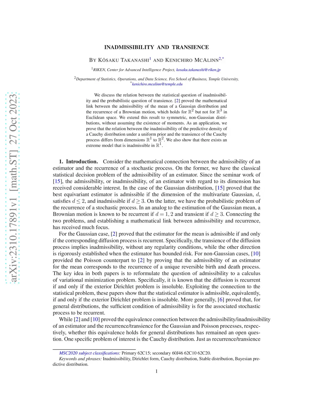 We discuss the relation between the statistical question of inadmissibility and the probabilistic question of transience. Brown (1971) proved the mathematical link between the admissibility of the mean of a Gaussian distribution and the recurrence of a Brownian motion, which holds for but not for in Euclidean space. We extend this result to symmetric, non-Gaussian distributions, without assuming the existence of moments. As an application, we prove that the relation between the inadmissibility of the predictive density of a Cauchy distribution under a uniform prior and the transience of the Cauchy process differs from dimensions to . We also show that there exists an extreme model that is inadmissible in .