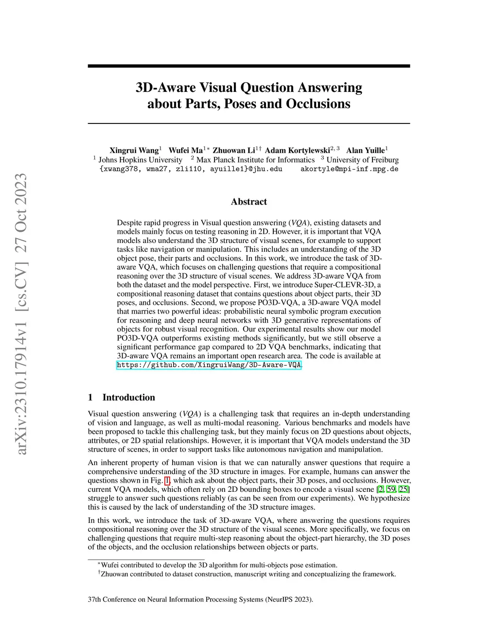 Despite rapid progress in Visual question answering (VQA), existing datasets and models mainly focus on testing reasoning in 2D. However, it is important that VQA models also understand the 3D structure of visual scenes, for example to support tasks like navigation or manipulation. This includes an understanding of the 3D object pose, their parts and occlusions. In this work, we introduce the task of 3D-aware VQA, which focuses on challenging questions that require a compositional reasoning over the 3D structure of visual scenes. We address 3D-aware VQA from both the dataset and the model perspective. First, we introduce Super-CLEVR-3D, a compositional reasoning dataset that contains questions about object parts, their 3D poses, and occlusions. Second, we propose PO3D-VQA, a 3D-aware VQA model that marries two powerful ideas: probabilistic neural symbolic program execution for reasoning and deep neural networks with 3D generative representations of objects for robust visual recognition. Our experimental results show our model PO3D-VQA outperforms existing methods significantly, but we still observe a significant performance gap compared to 2D VQA benchmarks, indicating that 3D-aware VQA remains an important open research area.