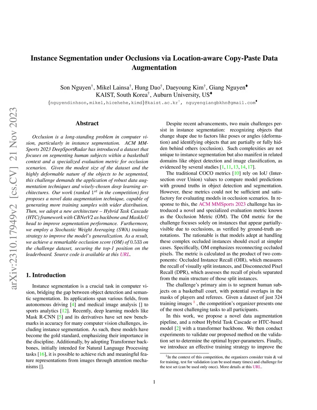 Occlusion is a long-standing problem in computer vision, particularly in instance segmentation. ACM MMSports 2023 DeepSportRadar has introduced a dataset that focuses on segmenting human subjects within a basketball context and a specialized evaluation metric for occlusion scenarios. Given the modest size of the dataset and the highly deformable nature of the objects to be segmented, this challenge demands the application of robust data augmentation techniques and wisely-chosen deep learning architectures. Our work (ranked 1st in the competition) first proposes a novel data augmentation technique, capable of generating more training samples with wider distribution. Then, we adopt a new architecture - Hybrid Task Cascade (HTC) framework with CBNetV2 as backbone and MaskIoU head to improve segmentation performance. Furthermore, we employ a Stochastic Weight Averaging (SWA) training strategy to improve the model's generalization. As a result, we achieve a remarkable occlusion score (OM) of 0.533 on the challenge dataset, securing the top-1 position on the leaderboard. Source code is available at this https://github.com/nguyendinhson-kaist/MMSports23-Seg-AutoID.