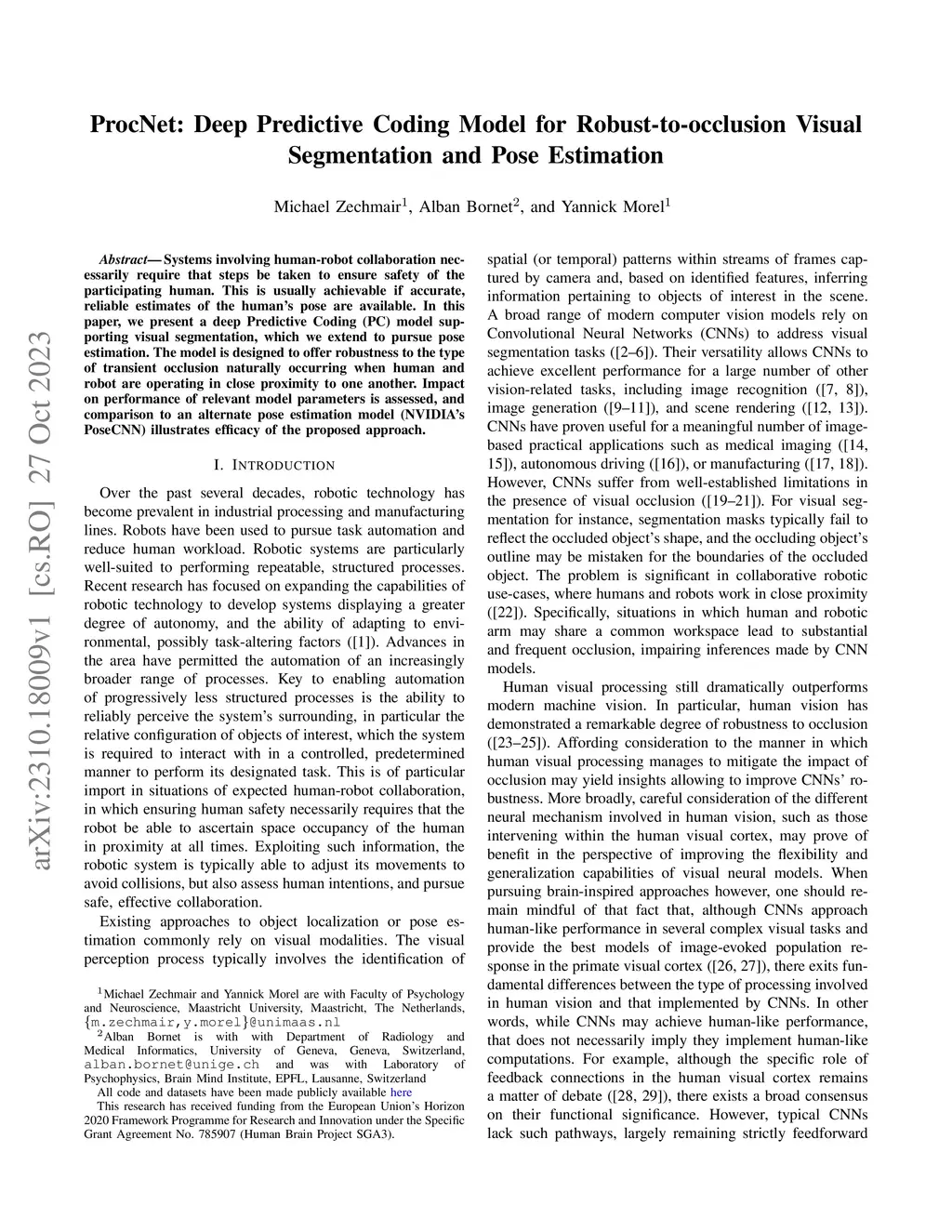 Systems involving human-robot collaboration necessarily require that steps be taken to ensure safety of the participating human. This is usually achievable if accurate, reliable estimates of the human's pose are available. In this paper, we present a deep Predictive Coding (PC) model supporting visual segmentation, which we extend to pursue pose estimation. The model is designed to offer robustness to the type of transient occlusion naturally occurring when human and robot are operating in close proximity to one another. Impact on performance of relevant model parameters is assessed, and comparison to an alternate pose estimation model (NVIDIA's PoseCNN) illustrates efficacy of the proposed approach.