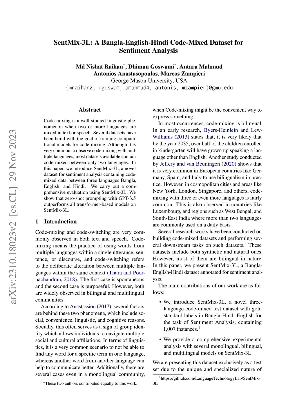 Code-mixing is a well-studied linguistic phenomenon when two or more languages are mixed in text or speech. Several datasets have been build with the goal of training computational models for code-mixing. Although it is very common to observe code-mixing with multiple languages, most datasets available contain code-mixed between only two languages. In this paper, we introduce SentMix-3L, a novel dataset for sentiment analysis containing code-mixed data between three languages Bangla, English, and Hindi. We carry out a comprehensive evaluation using SentMix-3L. We show that zero-shot prompting with GPT-3.5 outperforms all transformer-based models on SentMix-3L.
