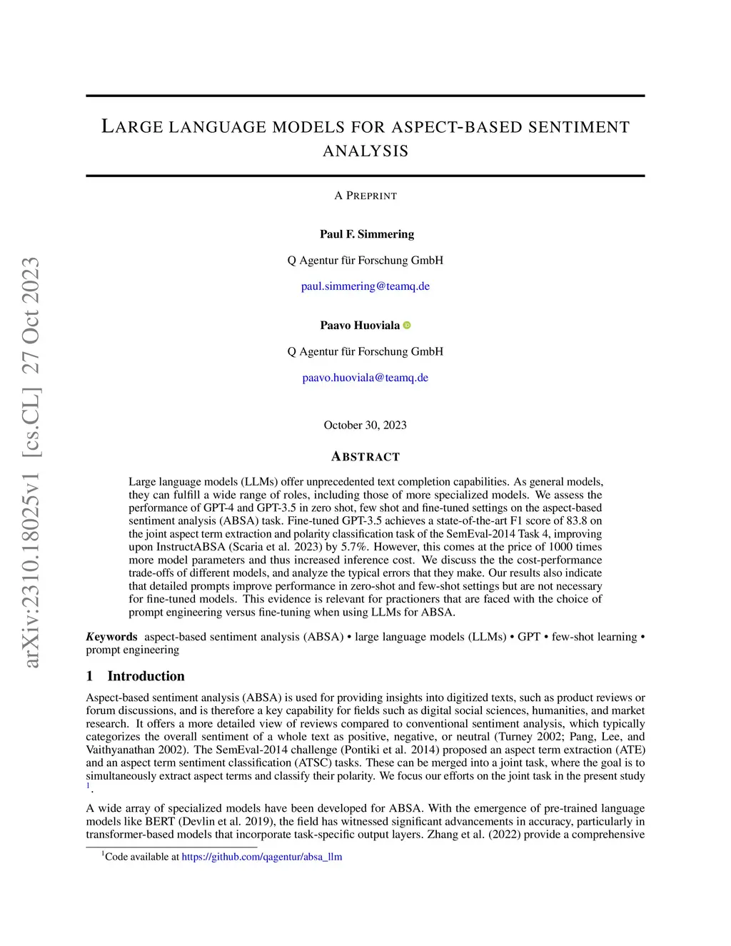 Large language models (LLMs) offer unprecedented text completion capabilities. As general models, they can fulfill a wide range of roles, including those of more specialized models. We assess the performance of GPT-4 and GPT-3.5 in zero shot, few shot and fine-tuned settings on the aspect-based sentiment analysis (ABSA) task. Fine-tuned GPT-3.5 achieves a state-of-the-art F1 score of 83.8 on the joint aspect term extraction and polarity classification task of the SemEval-2014 Task 4, improving upon InstructABSA [@scaria_instructabsa_2023] by 5.7%. However, this comes at the price of 1000 times more model parameters and thus increased inference cost. We discuss the the cost-performance trade-offs of different models, and analyze the typical errors that they make. Our results also indicate that detailed prompts improve performance in zero-shot and few-shot settings but are not necessary for fine-tuned models. This evidence is relevant for practioners that are faced with the choice of prompt engineering versus fine-tuning when using LLMs for ABSA.