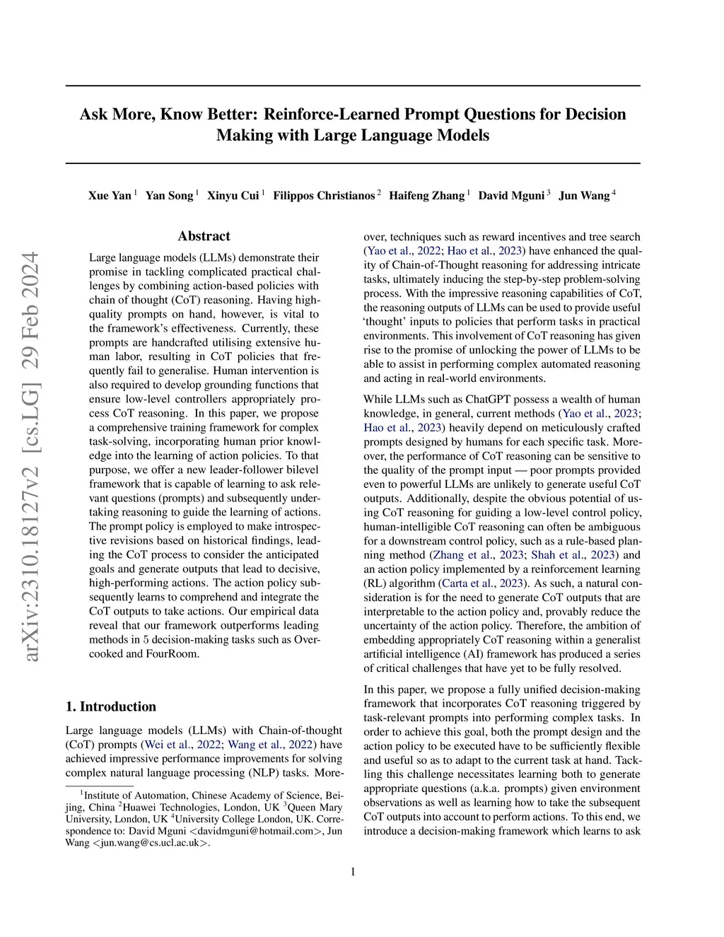 Large language models (LLMs) demonstrate their promise in tackling complicated practical challenges by combining action-based policies with chain of thought (CoT) reasoning. Having high-quality prompts on hand, however, is vital to the framework's effectiveness. Currently, these prompts are handcrafted utilising extensive human labor, resulting in CoT policies that frequently fail to generalise. Human intervention is also required to develop grounding functions that ensure low-level controllers appropriately process CoT reasoning. In this paper, we propose a comprehensive training framework for complex task-solving, incorporating human prior knowledge into the learning of action policies. To that purpose, we offer a new leader-follower bilevel framework that is capable of learning to ask relevant questions (prompts) and subsequently undertaking reasoning to guide the learning of actions. The prompt policy is employed to make introspective revisions based on historical findings, leading the CoT process to consider the anticipated goals and generate outputs that lead to decisive, high-performing actions. The action policy subsequently learns to comprehend and integrate the CoT outputs to take actions. Our empirical data reveal that our framework outperforms leading methods in decision-making tasks such as Overcooked and FourRoom.
