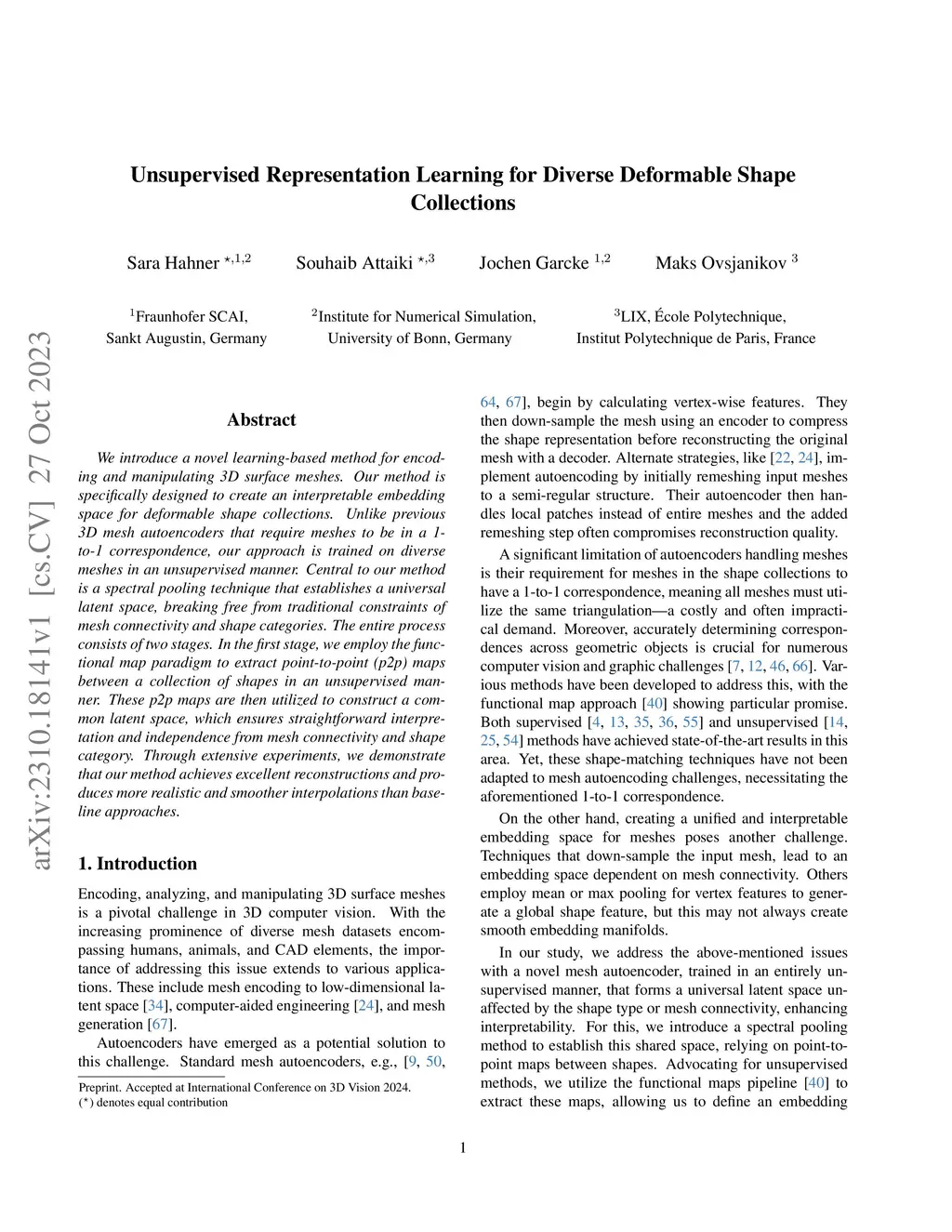 We introduce a novel learning-based method for encoding and manipulating 3D surface meshes. Our method is specifically designed to create an interpretable embedding space for deformable shape collections. Unlike previous 3D mesh autoencoders that require meshes to be in a 1-to-1 correspondence, our approach is trained on diverse meshes in an unsupervised manner. Central to our method is a spectral pooling technique that establishes a universal latent space, breaking free from traditional constraints of mesh connectivity and shape categories. The entire process consists of two stages. In the first stage, we employ the functional map paradigm to extract point-to-point (p2p) maps between a collection of shapes in an unsupervised manner. These p2p maps are then utilized to construct a common latent space, which ensures straightforward interpretation and independence from mesh connectivity and shape category. Through extensive experiments, we demonstrate that our method achieves excellent reconstructions and produces more realistic and smoother interpolations than baseline approaches.