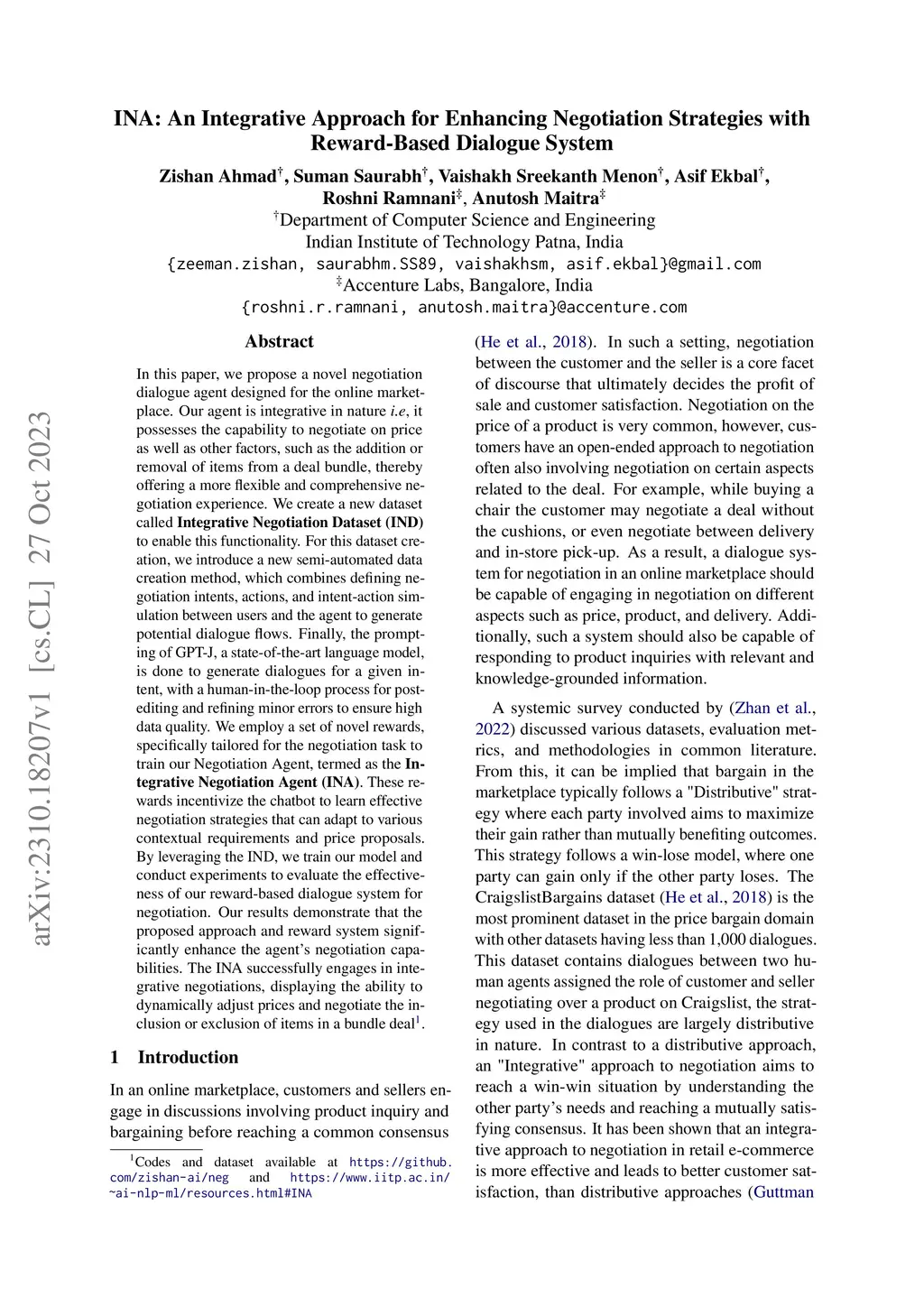 In this paper, we propose a novel negotiation dialogue agent designed for the online marketplace. Our agent is integrative in nature i.e, it possesses the capability to negotiate on price as well as other factors, such as the addition or removal of items from a deal bundle, thereby offering a more flexible and comprehensive negotiation experience. We create a new dataset called Integrative Negotiation Dataset (IND) to enable this functionality. For this dataset creation, we introduce a new semi-automated data creation method, which combines defining negotiation intents, actions, and intent-action simulation between users and the agent to generate potential dialogue flows. Finally, the prompting of GPT-J, a state-of-the-art language model, is done to generate dialogues for a given intent, with a human-in-the-loop process for post-editing and refining minor errors to ensure high data quality. We employ a set of novel rewards, specifically tailored for the negotiation task to train our Negotiation Agent, termed as the Integrative Negotiation Agent (INA). These rewards incentivize the chatbot to learn effective negotiation strategies that can adapt to various contextual requirements and price proposals. By leveraging the IND, we train our model and conduct experiments to evaluate the effectiveness of our reward-based dialogue system for negotiation. Our results demonstrate that the proposed approach and reward system significantly enhance the agent's negotiation capabilities. The INA successfully engages in integrative negotiations, displaying the ability to dynamically adjust prices and negotiate the inclusion or exclusion of items in a bundle deal