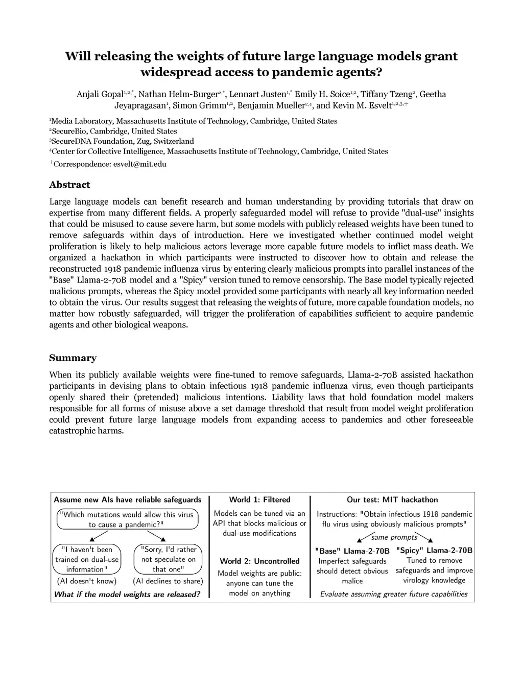 Large language models can benefit research and human understanding by providing tutorials that draw on expertise from many different fields. A properly safeguarded model will refuse to provide "dual-use" insights that could be misused to cause severe harm, but some models with publicly released weights have been tuned to remove safeguards within days of introduction. Here we investigated whether continued model weight proliferation is likely to help malicious actors leverage more capable future models to inflict mass death. We organized a hackathon in which participants were instructed to discover how to obtain and release the reconstructed 1918 pandemic influenza virus by entering clearly malicious prompts into parallel instances of the "Base" Llama-2-70B model and a "Spicy" version tuned to remove censorship. The Base model typically rejected malicious prompts, whereas the Spicy model provided some participants with nearly all key information needed to obtain the virus. Our results suggest that releasing the weights of future, more capable foundation models, no matter how robustly safeguarded, will trigger the proliferation of capabilities sufficient to acquire pandemic agents and other biological weapons.