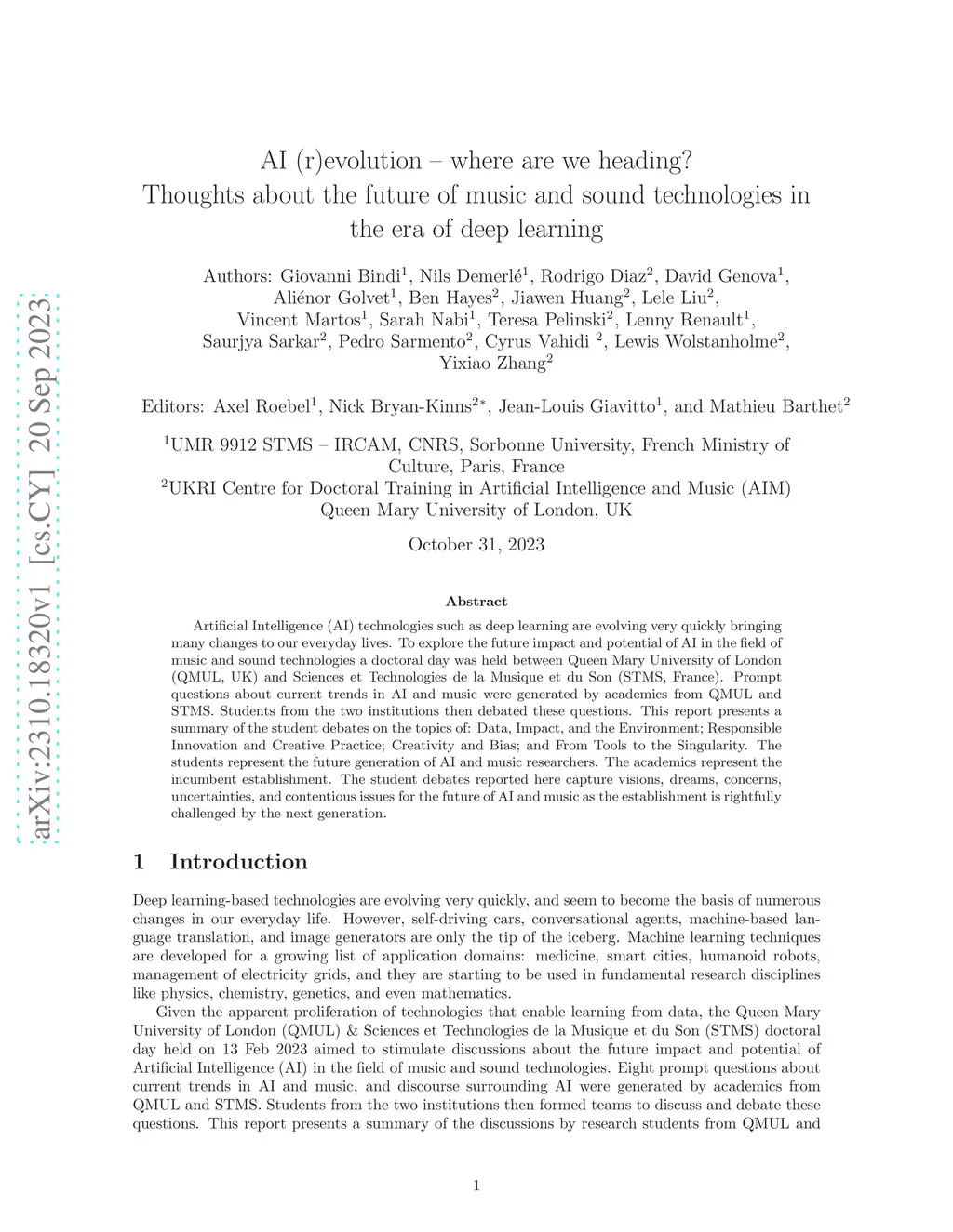Artificial Intelligence (AI) technologies such as deep learning are evolving very quickly bringing many changes to our everyday lives. To explore the future impact and potential of AI in the field of music and sound technologies a doctoral day was held between Queen Mary University of London (QMUL, UK) and Sciences et Technologies de la Musique et du Son (STMS, France). Prompt questions about current trends in AI and music were generated by academics from QMUL and STMS. Students from the two institutions then debated these questions. This report presents a summary of the student debates on the topics of: Data, Impact, and the Environment; Responsible Innovation and Creative Practice; Creativity and Bias; and From Tools to the Singularity. The students represent the future generation of AI and music researchers. The academics represent the incumbent establishment. The student debates reported here capture visions, dreams, concerns, uncertainties, and contentious issues for the future of AI and music as the establishment is rightfully challenged by the next generation.