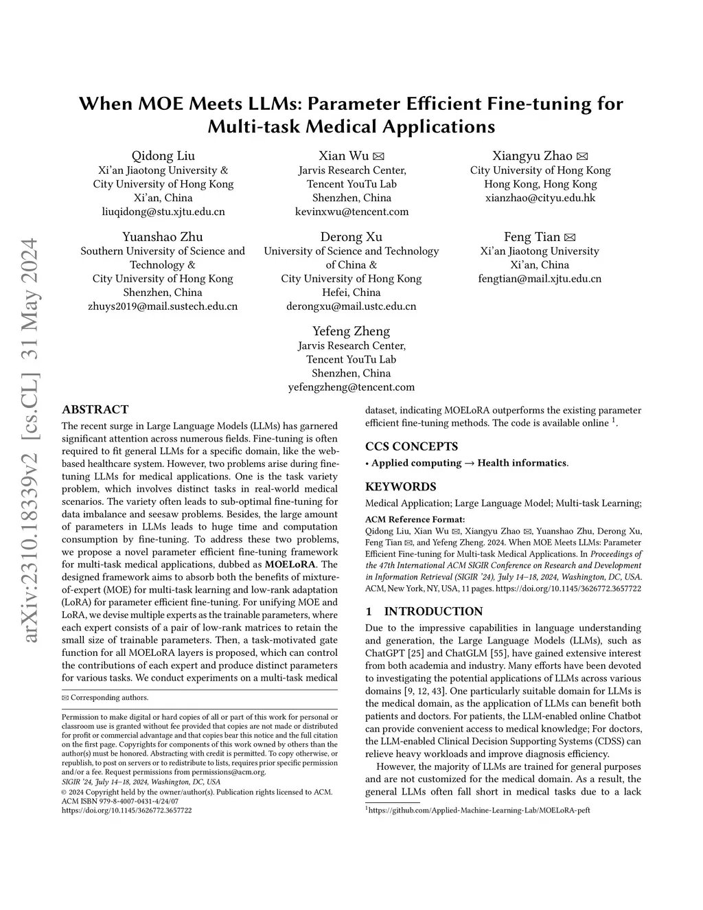 The recent surge in Large Language Models (LLMs) has garnered significant attention across numerous fields. Fine-tuning is often required to fit general LLMs for a specific domain, like the web-based healthcare system. However, two problems arise during fine-tuning LLMs for medical applications. One is the task variety problem, which involves distinct tasks in real-world medical scenarios. The variety often leads to sub-optimal fine-tuning for data imbalance and seesaw problems. Besides, the large amount of parameters in LLMs leads to huge time and computation consumption by fine-tuning. To address these two problems, we propose a novel parameter efficient fine-tuning framework for multi-task medical applications, dubbed as MOELoRA. The designed framework aims to absorb both the benefits of mixture-of-expert (MOE) for multi-task learning and low-rank adaptation (LoRA) for parameter efficient fine-tuning. For unifying MOE and LoRA, we devise multiple experts as the trainable parameters, where each expert consists of a pair of low-rank matrices to retain the small size of trainable parameters. Then, a task-motivated gate function for all MOELoRA layers is proposed, which can control the contributions of each expert and produce distinct parameters for various tasks. We conduct experiments on a multi-task medical dataset, indicating MOELoRA outperforms the existing parameter efficient fine-tuning methods. The code is available online.