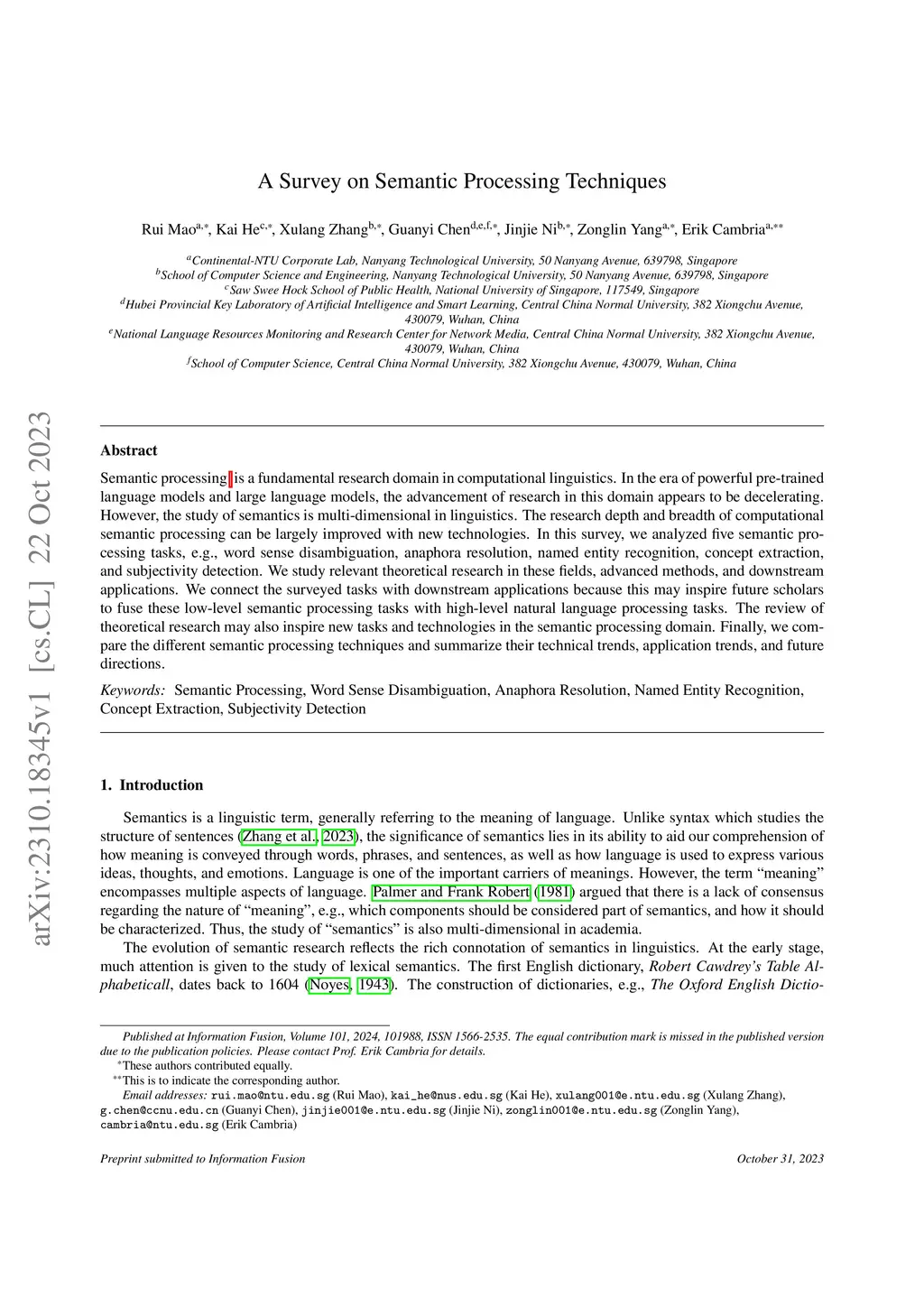 Semantic processing is a fundamental research domain in computational linguistics. In the era of powerful pre-trained language models and large language models, the advancement of research in this domain appears to be decelerating. However, the study of semantics is multi-dimensional in linguistics. The research depth and breadth of computational semantic processing can be largely improved with new technologies. In this survey, we analyzed five semantic processing tasks, e.g., word sense disambiguation, anaphora resolution, named entity recognition, concept extraction, and subjectivity detection. We study relevant theoretical research in these fields, advanced methods, and downstream applications. We connect the surveyed tasks with downstream applications because this may inspire future scholars to fuse these low-level semantic processing tasks with high-level natural language processing tasks. The review of theoretical research may also inspire new tasks and technologies in the semantic processing domain. Finally, we compare the different semantic processing techniques and summarize their technical trends, application trends, and future directions.