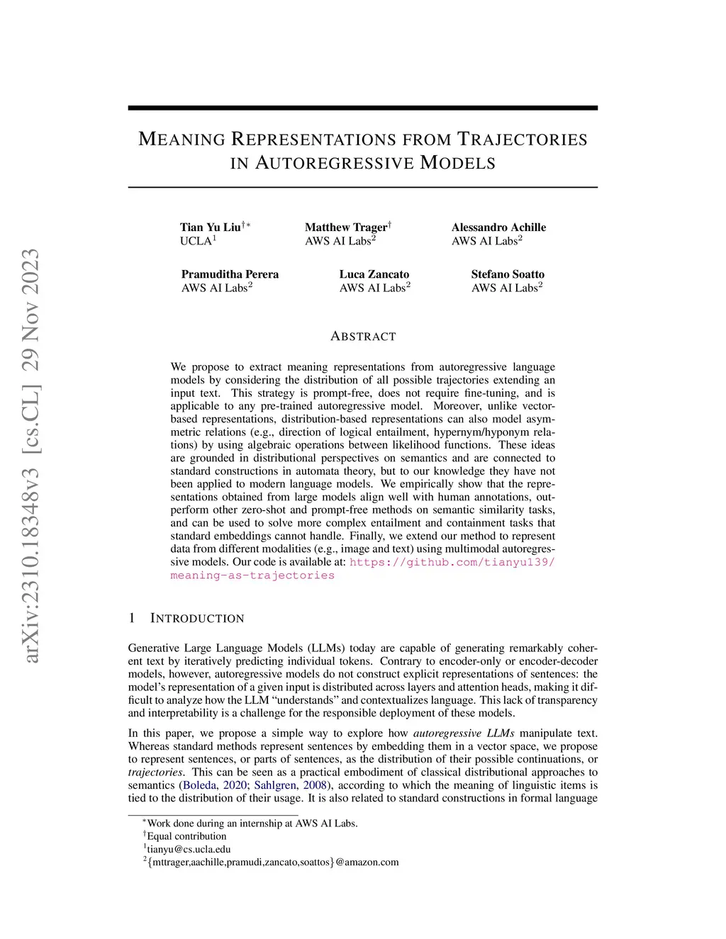 We propose to extract meaning representations from autoregressive language models by considering the distribution of all possible trajectories extending an input text. This strategy is prompt-free, does not require fine-tuning, and is applicable to any pre-trained autoregressive model. Moreover, unlike vector-based representations, distribution-based representations can also model asymmetric relations (e.g., direction of logical entailment, hypernym/hyponym relations) by using algebraic operations between likelihood functions. These ideas are grounded in distributional perspectives on semantics and are connected to standard constructions in automata theory, but to our knowledge they have not been applied to modern language models. We empirically show that the representations obtained from large models align well with human annotations, outperform other zero-shot and prompt-free methods on semantic similarity tasks, and can be used to solve more complex entailment and containment tasks that standard embeddings cannot handle. Finally, we extend our method to represent data from different modalities (e.g., image and text) using multimodal autoregressive models. Our code is available at: https://github.com/tianyu139/meaning-as-trajectories