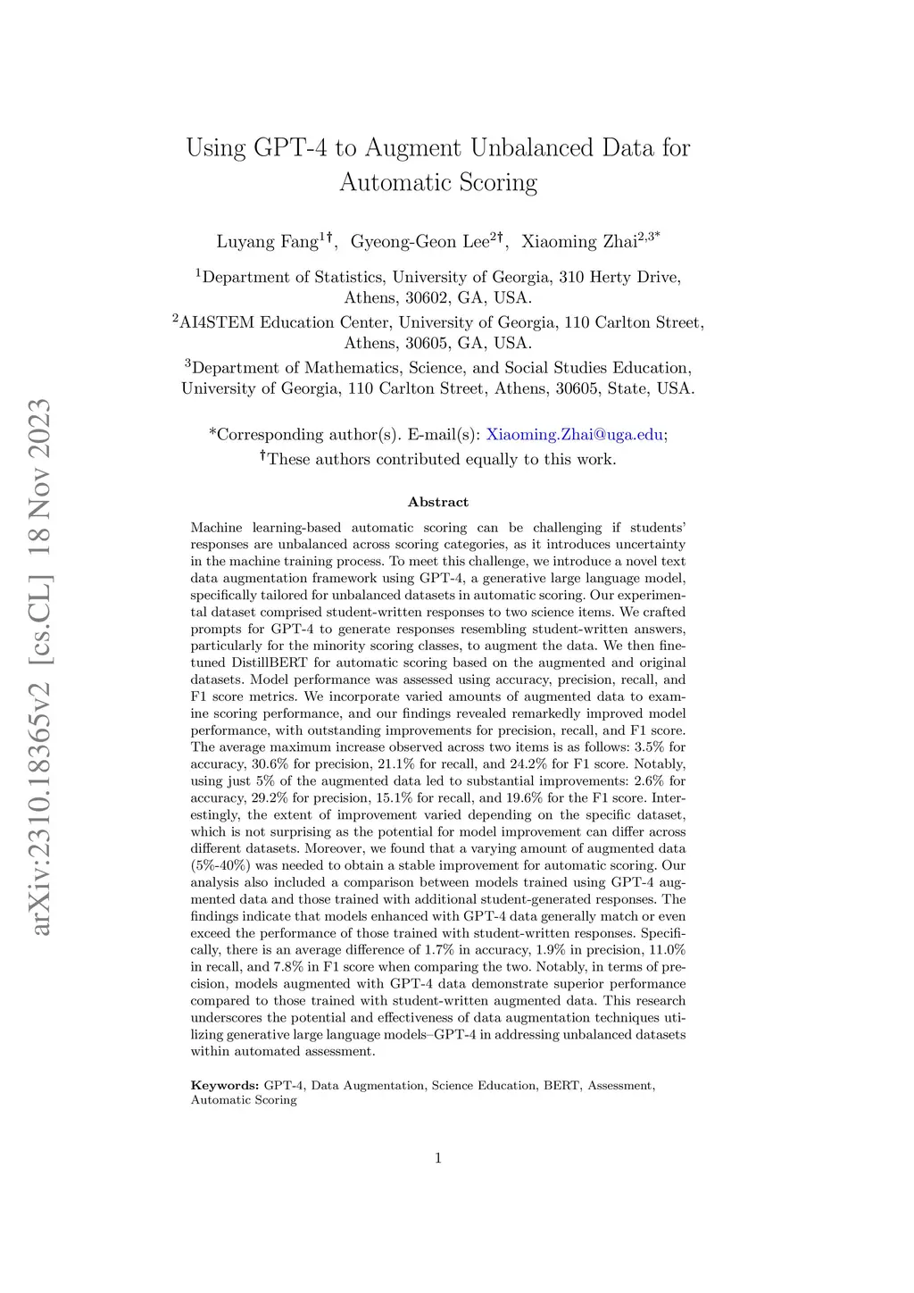 Machine learning-based automatic scoring can be challenging if students' responses are unbalanced across scoring categories, as it introduces uncertainty in the machine training process. To meet this challenge, we introduce a novel text data augmentation framework using GPT-4, a generative large language model, specifically tailored for unbalanced datasets in automatic scoring. Our experimental dataset comprised student-written responses to two science items. We crafted prompts for GPT-4 to generate responses resembling student-written answers, particularly for the minority scoring classes, to augment the data. We then finetuned DistillBERT for automatic scoring based on the augmented and original datasets. Model performance was assessed using accuracy, precision, recall, and F1 score. We incorporate varied amounts of augmented data to examine scoring performance, and our findings revealed remarkedly improved model performance. The average maximum increase observed across two items is: 3.5% for accuracy, 30.6% for precision, 21.1% for recall, and 24.2% for F1 score. Notably, using just 5% of the augmented data led to substantial improvements: 2.6%, 29.2%, 15.1%, and 19.6%. Interestingly, the extent of improvement varied depending on specific datasets. Moreover, we found that a varying amount of augmented data (5%-40%) was needed to obtain a stable improvement. We also compare models trained with GPT-4 augmented data and those trained with additional student-written responses. The findings indicate that former ones match or even exceed the performance of the latter. Specifically, there is an average difference of 1.7%, 1.9%, 11.0%, and 7.8% for four metrics separately. This research underscores the potential and effectiveness of data augmentation techniques utilizing GPT-4 in addressing unbalanced datasets within automated assessment.