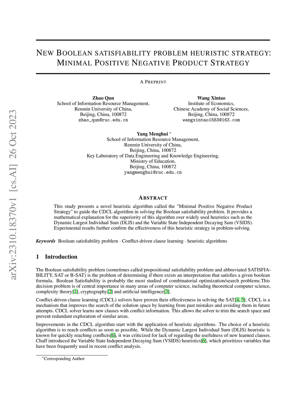 This study presents a novel heuristic algorithm called the "Minimal Positive Negative Product Strategy" to guide the CDCL algorithm in solving the Boolean satisfiability problem. It provides a mathematical explanation for the superiority of this algorithm over widely used heuristics such as the Dynamic Largest Individual Sum (DLIS) and the Variable State Independent Decaying Sum (VSIDS). Experimental results further confirm the effectiveness of this heuristic strategy in problem-solving.
