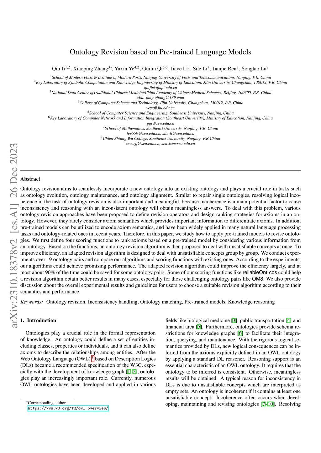Ontology revision aims to seamlessly incorporate new information into an existing ontology and plays a crucial role in tasks such as ontology evolution, ontology maintenance, and ontology alignment. Similar to repair single ontologies, resolving logical incoherence in the task of ontology revision is also important and meaningful since incoherence is a main potential factor to cause inconsistency and reasoning with an inconsistent ontology will obtain meaningless answers. To deal with this problem, various ontology revision methods have been proposed to define revision operators and design ranking strategies for axioms in an ontology. However, they rarely consider axiom semantics which provides important information to differentiate axioms. On the other hand, pre-trained models can be utilized to encode axiom semantics, and have been widely applied in many natural language processing tasks and ontology-related ones in recent years. Therefore, in this paper, we define four scoring functions to rank axioms based on a pre-trained model by considering various information from a rebuttal ontology and its corresponding reliable ontology. Based on such a scoring function, we propose an ontology revision algorithm to deal with unsatisfiable concepts at once. If it is hard to resolve all unsatisfiable concepts in a rebuttal ontology together, an adapted revision algorithm is designed to deal with them group by group. We conduct experiments over 19 ontology pairs and compare our algorithms and scoring functions with existing ones. According to the experiments, it shows that our algorithms could achieve promising performance. The adapted revision algorithm could improve the efficiency largely, and at most 96% time could be saved for some ontology pairs. Some of our scoring functions help a revision algorithm obtain better results in many cases, especially for the challenging pairs.