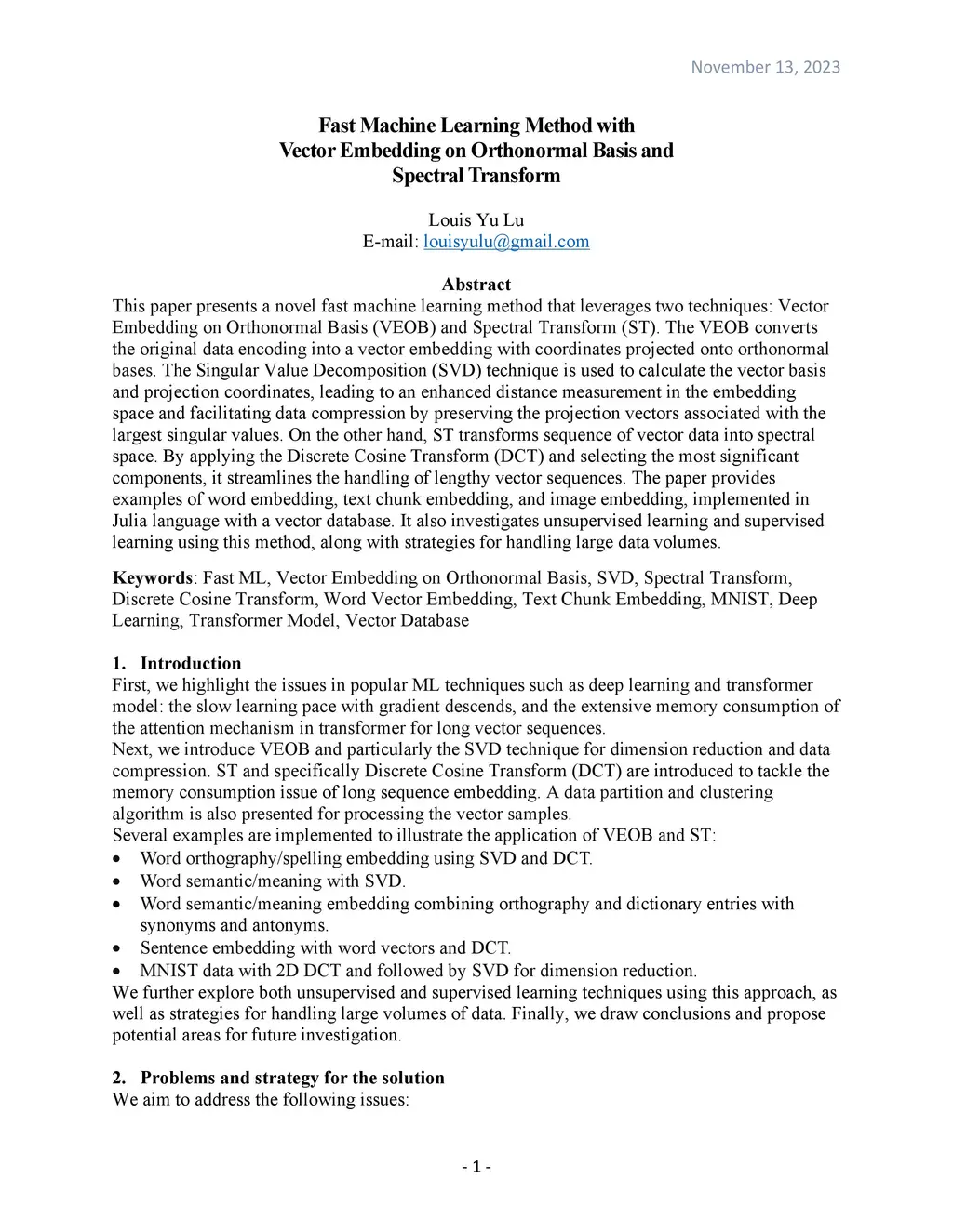 This paper presents a novel fast machine learning method that leverages two techniques: Vector Embedding on Orthonormal Basis (VEOB) and Spectral Transform (ST). The VEOB converts the original data encoding into a vector embedding with coordinates projected onto orthonormal bases. The Singular Value Decomposition (SVD) technique is used to calculate the vector basis and projection coordinates, leading to an enhanced distance measurement in the embedding space and facilitating data compression by preserving the projection vectors associated with the largest singular values. On the other hand, ST transforms sequence of vector data into spectral space. By applying the Discrete Cosine Transform (DCT) and selecting the most significant components, it streamlines the handling of lengthy vector sequences. The paper provides examples of word embedding, text chunk embedding, and image embedding, implemented in Julia language with a vector database. It also investigates unsupervised learning and supervised learning using this method, along with strategies for handling large data volumes.