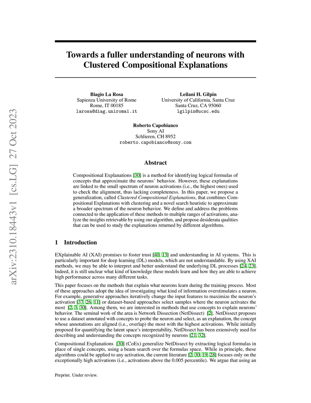 Compositional Explanations is a method for identifying logical formulas of concepts that approximate the neurons' behavior. However, these explanations are linked to the small spectrum of neuron activations (i.e., the highest ones) used to check the alignment, thus lacking completeness. In this paper, we propose a generalization, called Clustered Compositional Explanations, that combines Compositional Explanations with clustering and a novel search heuristic to approximate a broader spectrum of the neurons' behavior. We define and address the problems connected to the application of these methods to multiple ranges of activations, analyze the insights retrievable by using our algorithm, and propose desiderata qualities that can be used to study the explanations returned by different algorithms.