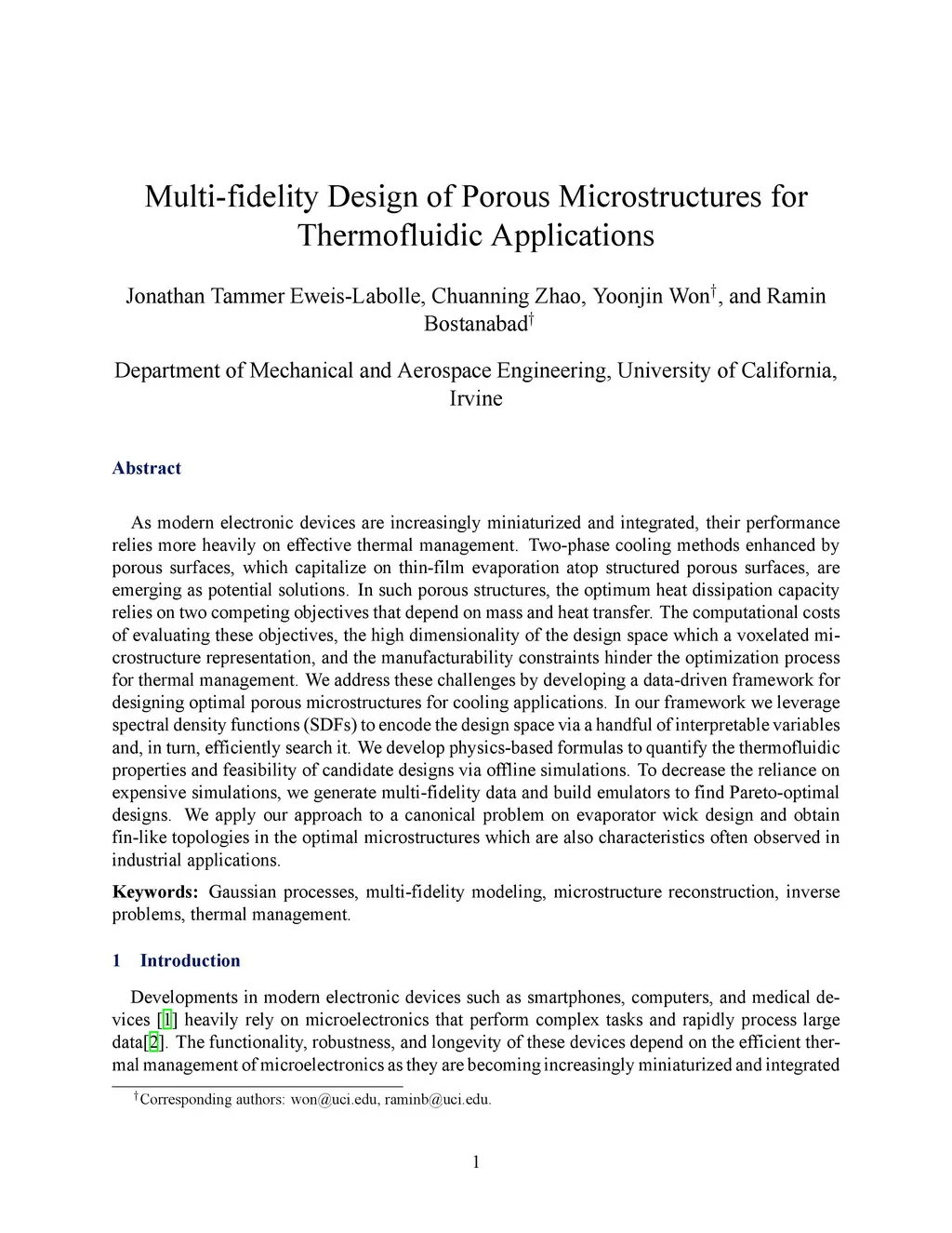 As modern electronic devices are increasingly miniaturized and integrated, their performance relies more heavily on effective thermal management. Two-phase cooling methods enhanced by porous surfaces, which capitalize on thin-film evaporation atop structured porous surfaces, are emerging as potential solutions. In such porous structures, the optimum heat dissipation capacity relies on two competing objectives that depend on mass and heat transfer. The computational costs of evaluating these objectives, the high dimensionality of the design space which a voxelated microstructure representation, and the manufacturability constraints hinder the optimization process for thermal management. We address these challenges by developing a data-driven framework for designing optimal porous microstructures for cooling applications. In our framework we leverage spectral density functions (SDFs) to encode the design space via a handful of interpretable variables and, in turn, efficiently search it. We develop physics-based formulas to quantify the thermofluidic properties and feasibility of candidate designs via offline simulations. To decrease the reliance on expensive simulations, we generate multi-fidelity data and build emulators to find Pareto-optimal designs. We apply our approach to a canonical problem on evaporator wick design and obtain fin-like topologies in the optimal microstructures which are also characteristics often observed in industrial applications.