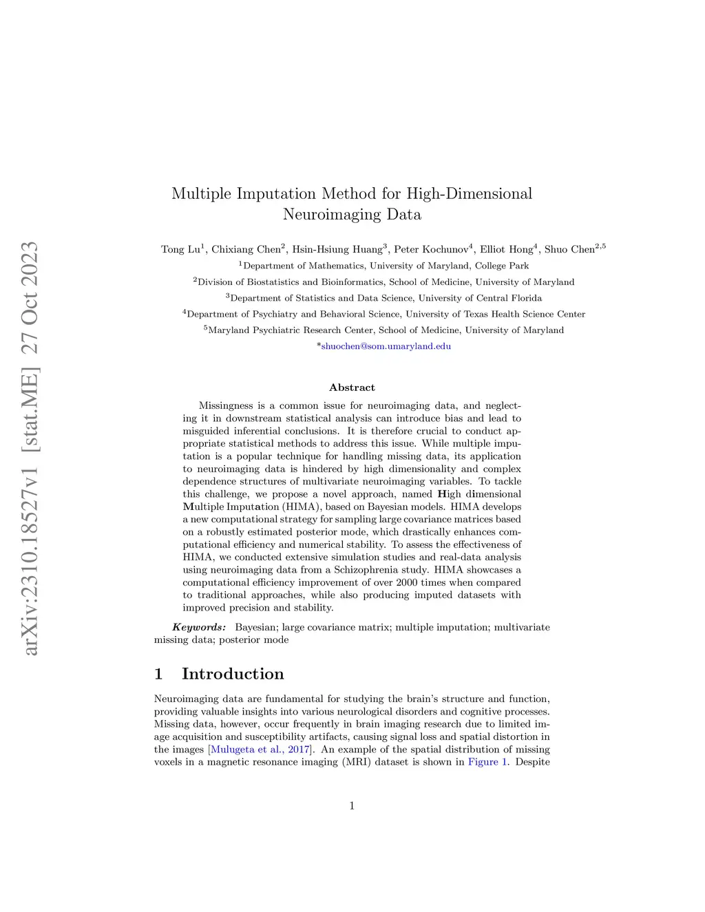 Missingness is a common issue for neuroimaging data, and neglecting it in downstream statistical analysis can introduce bias and lead to misguided inferential conclusions. It is therefore crucial to conduct appropriate statistical methods to address this issue. While multiple imputation is a popular technique for handling missing data, its application to neuroimaging data is hindered by high dimensionality and complex dependence structures of multivariate neuroimaging variables. To tackle this challenge, we propose a novel approach, named High Dimensional Multiple Imputation (HIMA), based on Bayesian models. HIMA develops a new computational strategy for sampling large covariance matrices based on a robustly estimated posterior mode, which drastically enhances computational efficiency and numerical stability. To assess the effectiveness of HIMA, we conducted extensive simulation studies and real-data analysis using neuroimaging data from a Schizophrenia study. HIMA showcases a computational efficiency improvement of over 2000 times when compared to traditional approaches, while also producing imputed datasets with improved precision and stability.
