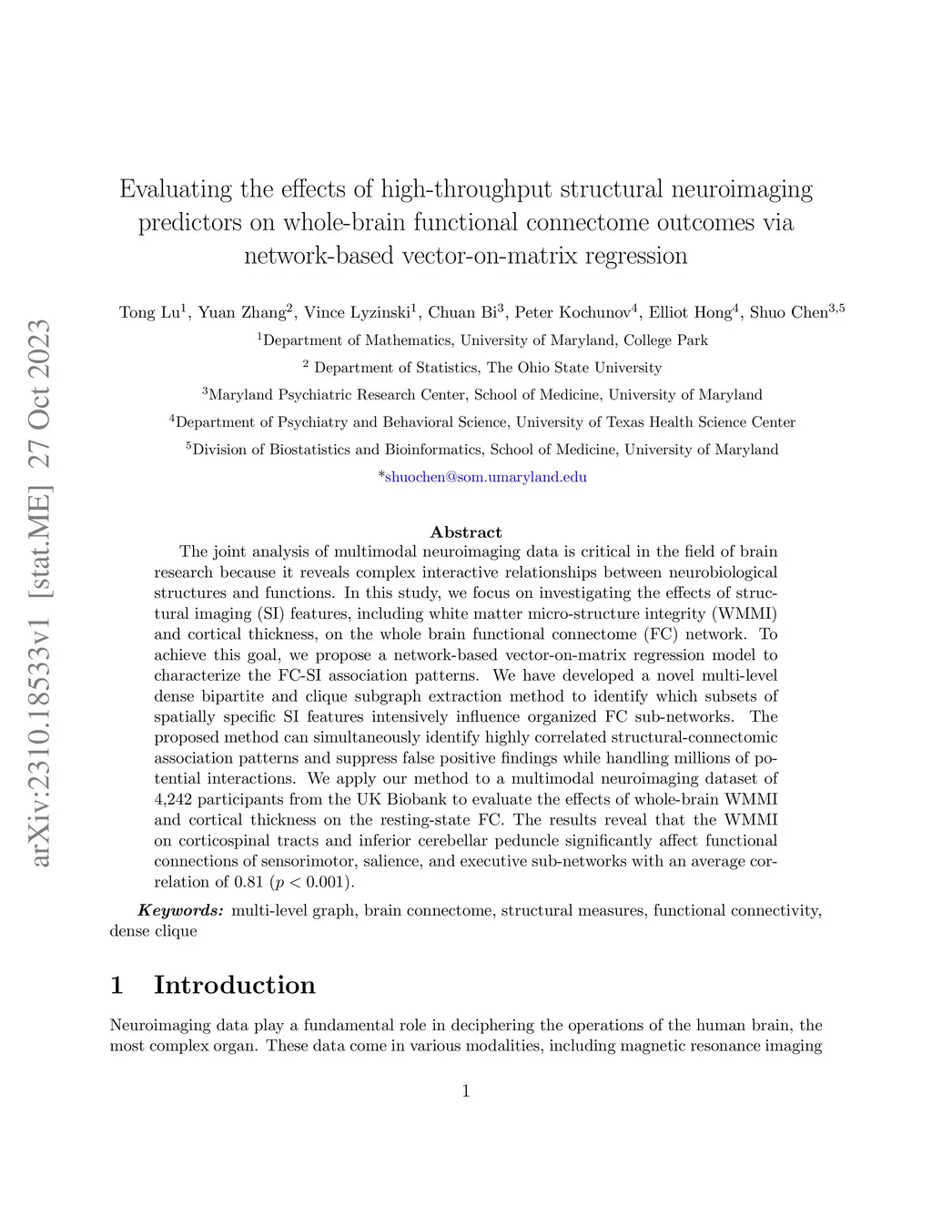 The joint analysis of multimodal neuroimaging data is critical in the field of brain research because it reveals complex interactive relationships between neurobiological structures and functions. In this study, we focus on investigating the effects of structural imaging (SI) features, including white matter micro-structure integrity (WMMI) and cortical thickness, on the whole brain functional connectome (FC) network. To achieve this goal, we propose a network-based vector-on-matrix regression model to characterize the FC-SI association patterns. We have developed a novel multi-level dense bipartite and clique subgraph extraction method to identify which subsets of spatially specific SI features intensively influence organized FC sub-networks. The proposed method can simultaneously identify highly correlated structural-connectomic association patterns and suppress false positive findings while handling millions of potential interactions. We apply our method to a multimodal neuroimaging dataset of 4,242 participants from the UK Biobank to evaluate the effects of whole-brain WMMI and cortical thickness on the resting-state FC. The results reveal that the WMMI on corticospinal tracts and inferior cerebellar peduncle significantly affect functional connections of sensorimotor, salience, and executive sub-networks with an average correlation of 0.81 (p<0.001).