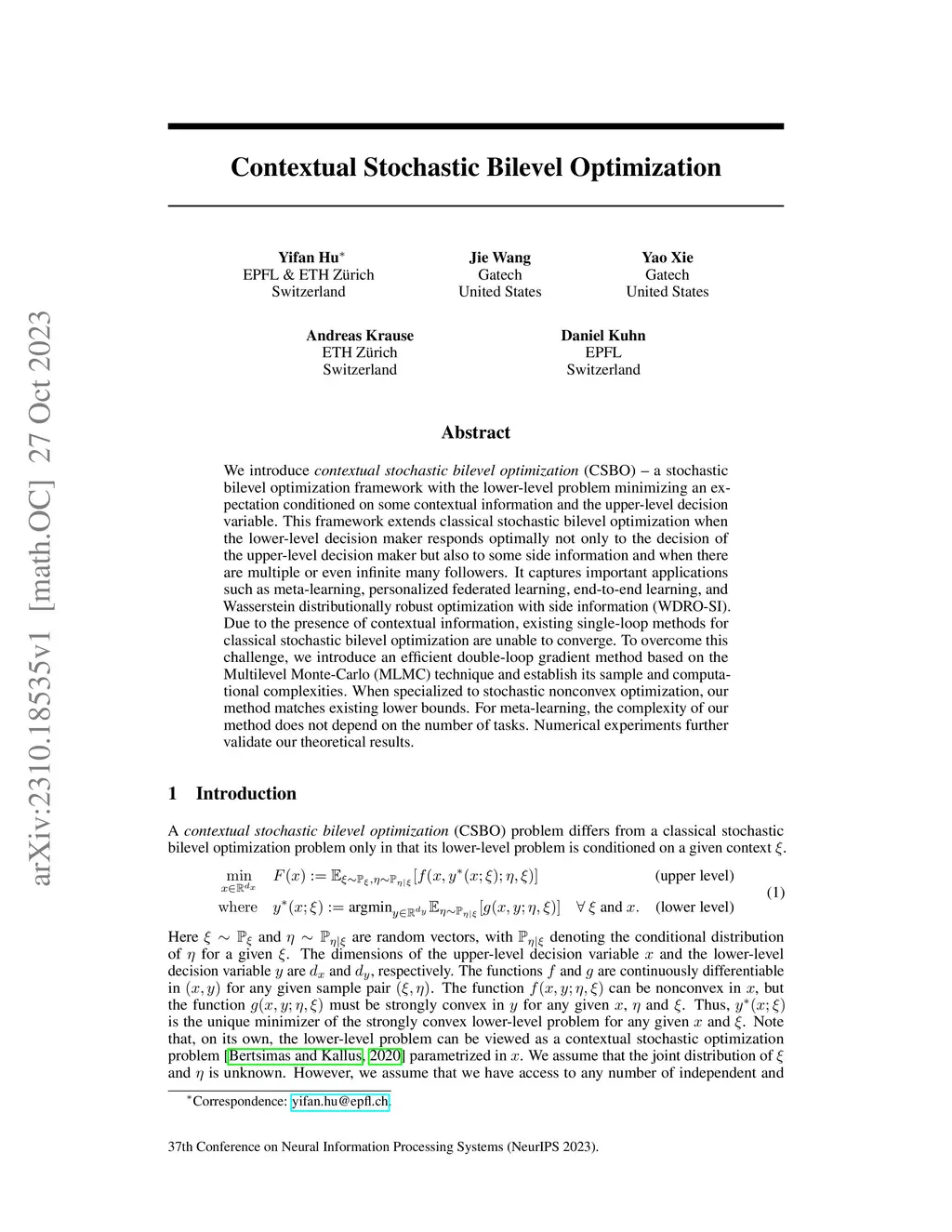 We introduce contextual stochastic bilevel optimization (CSBO) -- a stochastic bilevel optimization framework with the lower-level problem minimizing an expectation conditioned on some contextual information and the upper-level decision variable. This framework extends classical stochastic bilevel optimization when the lower-level decision maker responds optimally not only to the decision of the upper-level decision maker but also to some side information and when there are multiple or even infinite many followers. It captures important applications such as meta-learning, personalized federated learning, end-to-end learning, and Wasserstein distributionally robust optimization with side information (WDRO-SI). Due to the presence of contextual information, existing single-loop methods for classical stochastic bilevel optimization are unable to converge. To overcome this challenge, we introduce an efficient double-loop gradient method based on the Multilevel Monte-Carlo (MLMC) technique and establish its sample and computational complexities. When specialized to stochastic nonconvex optimization, our method matches existing lower bounds. For meta-learning, the complexity of our method does not depend on the number of tasks. Numerical experiments further validate our theoretical results.