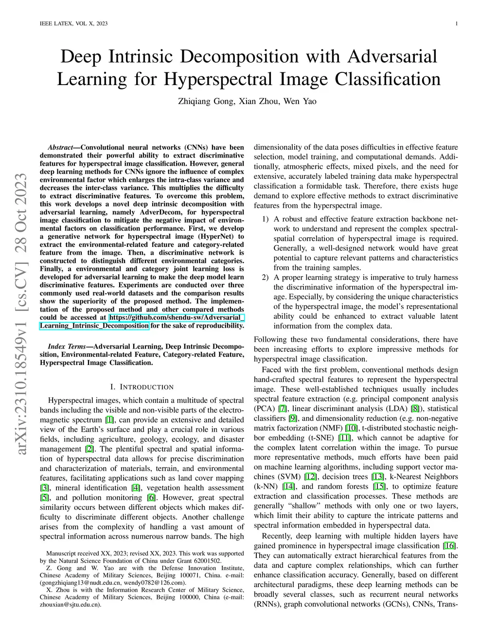 Convolutional neural networks (CNNs) have been demonstrated their powerful ability to extract discriminative features for hyperspectral image classification. However, general deep learning methods for CNNs ignore the influence of complex environmental factor which enlarges the intra-class variance and decreases the inter-class variance. This multiplies the difficulty to extract discriminative features. To overcome this problem, this work develops a novel deep intrinsic decomposition with adversarial learning, namely AdverDecom, for hyperspectral image classification to mitigate the negative impact of environmental factors on classification performance. First, we develop a generative network for hyperspectral image (HyperNet) to extract the environmental-related feature and category-related feature from the image. Then, a discriminative network is constructed to distinguish different environmental categories. Finally, a environmental and category joint learning loss is developed for adversarial learning to make the deep model learn discriminative features. Experiments are conducted over three commonly used real-world datasets and the comparison results show the superiority of the proposed method. The implementation of the proposed method and other compared methods could be accessed at https://github.com/shendu-sw/Adversarial Learning Intrinsic Decomposition for the sake of reproducibility.