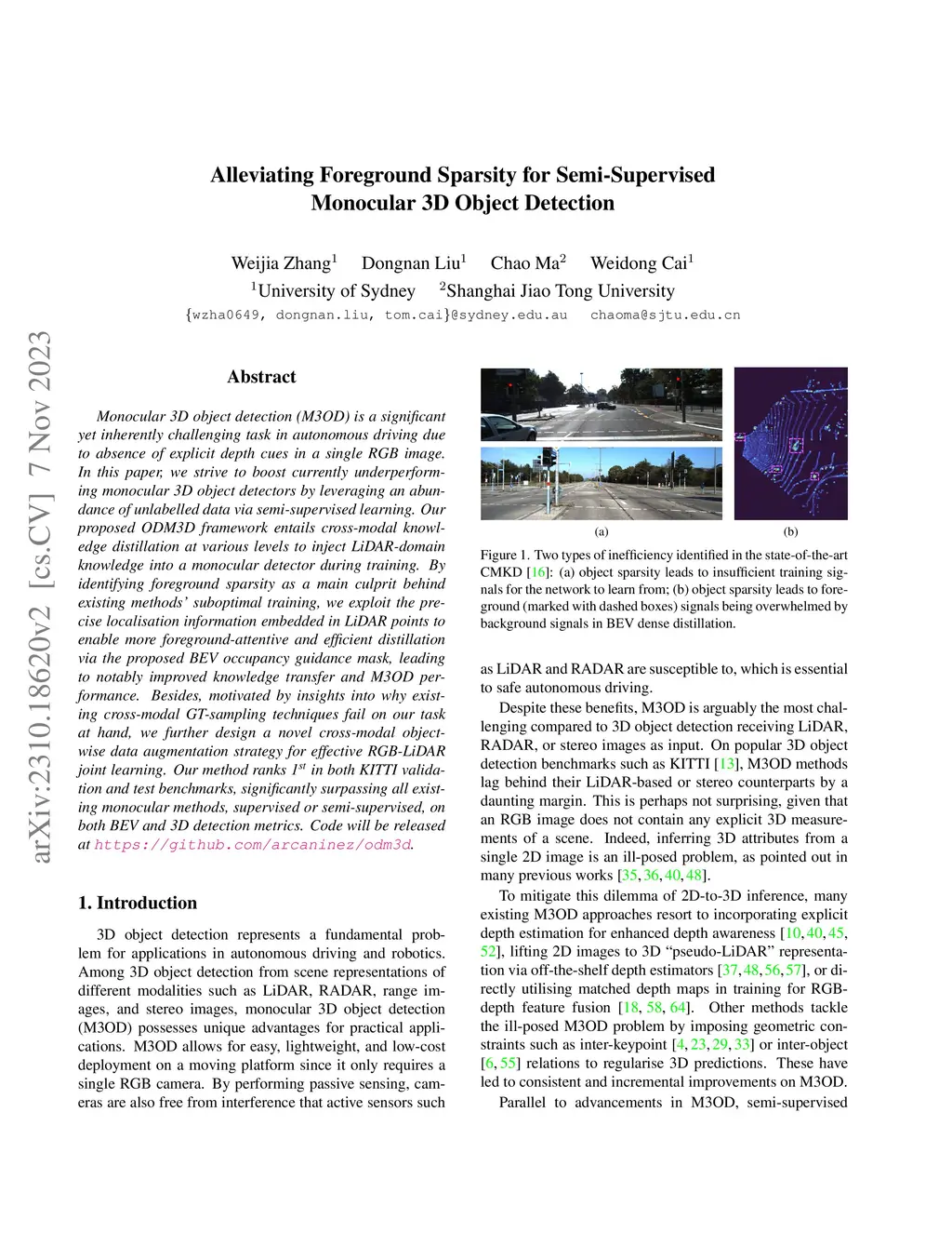 ODM3D: Alleviating Foreground Sparsity for Semi-Supervised Monocular 3D