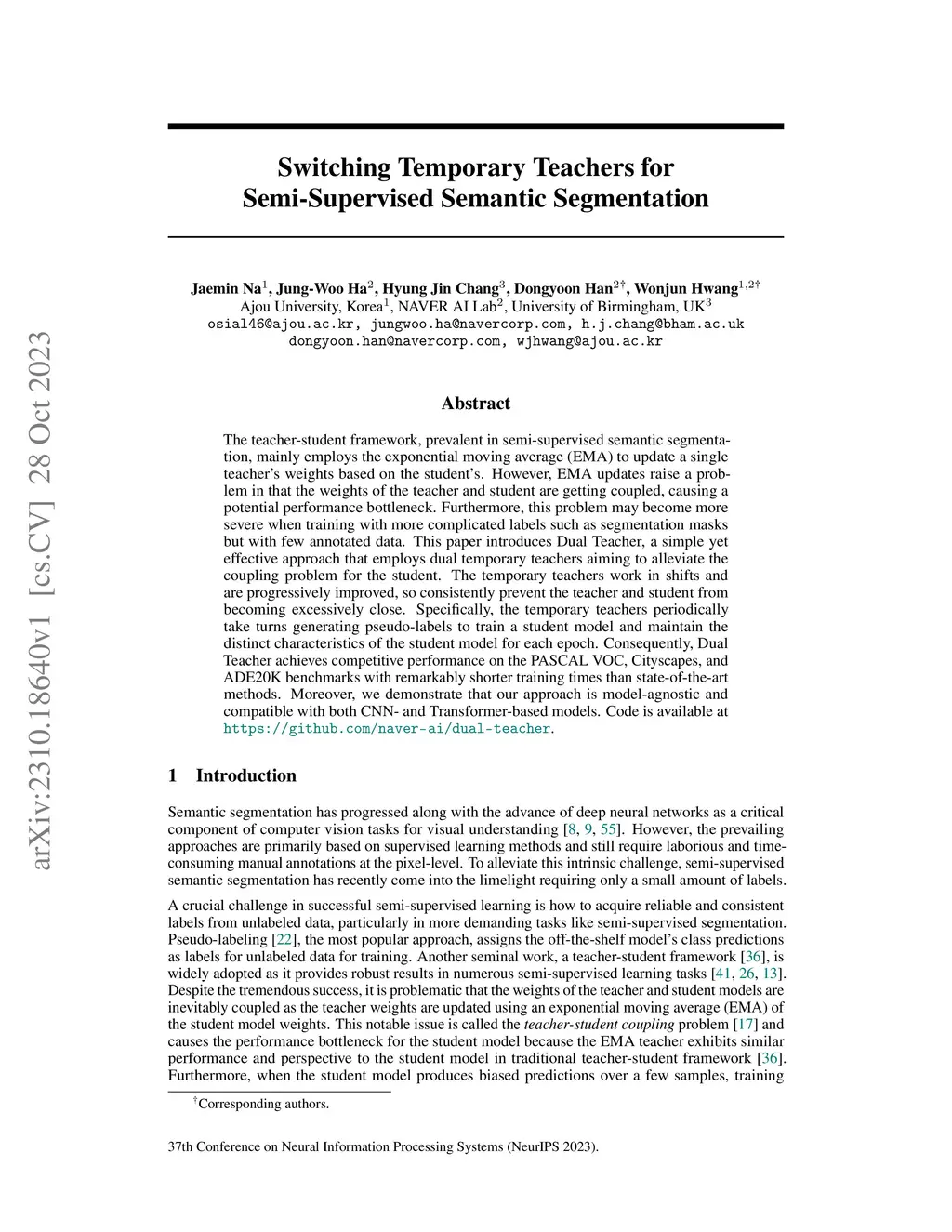 Switching Temporary Teachers for Semi-Supervised Semantic Segmentation