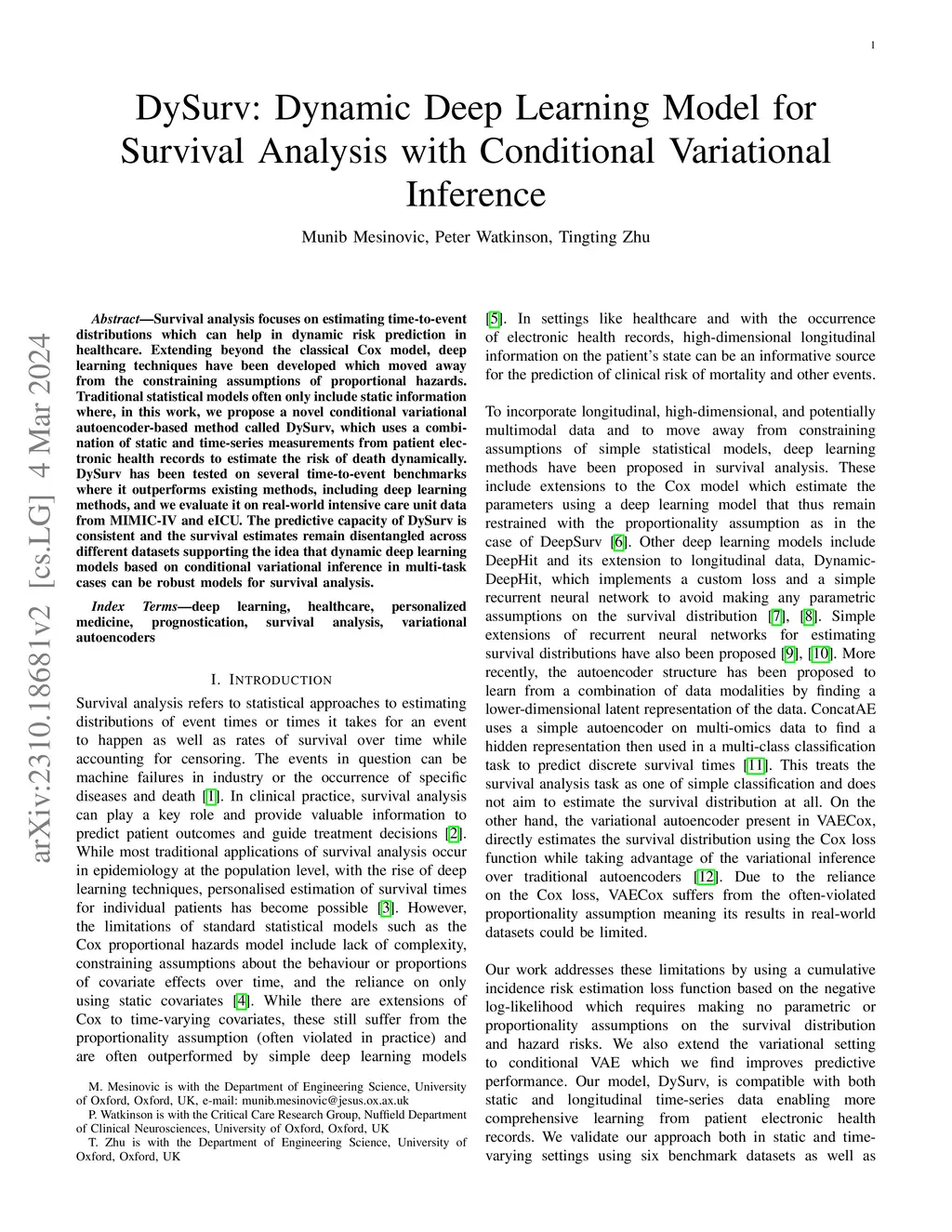 Survival analysis focuses on estimating time-to-event distributions which can help in dynamic risk prediction in healthcare. Extending beyond the classical Cox model, deep learning techniques have been developed which moved away from the constraining assumptions of proportional hazards. Traditional statistical models often only include static information where, in this work, we propose a novel conditional variational autoencoder-based method called DySurv, which uses a combination of static and time-series measurements from patient electronic health records to estimate the risk of death dynamically. DySurv has been tested on several time-to-event benchmarks where it outperforms existing methods, including deep learning methods, and we evaluate it on real-world intensive care unit data from MIMIC-IV and eICU. The predictive capacity of DySurv is consistent and the survival estimates remain disentangled across different datasets supporting the idea that dynamic deep learning models based on conditional variational inference in multi-task cases can be robust models for survival analysis.