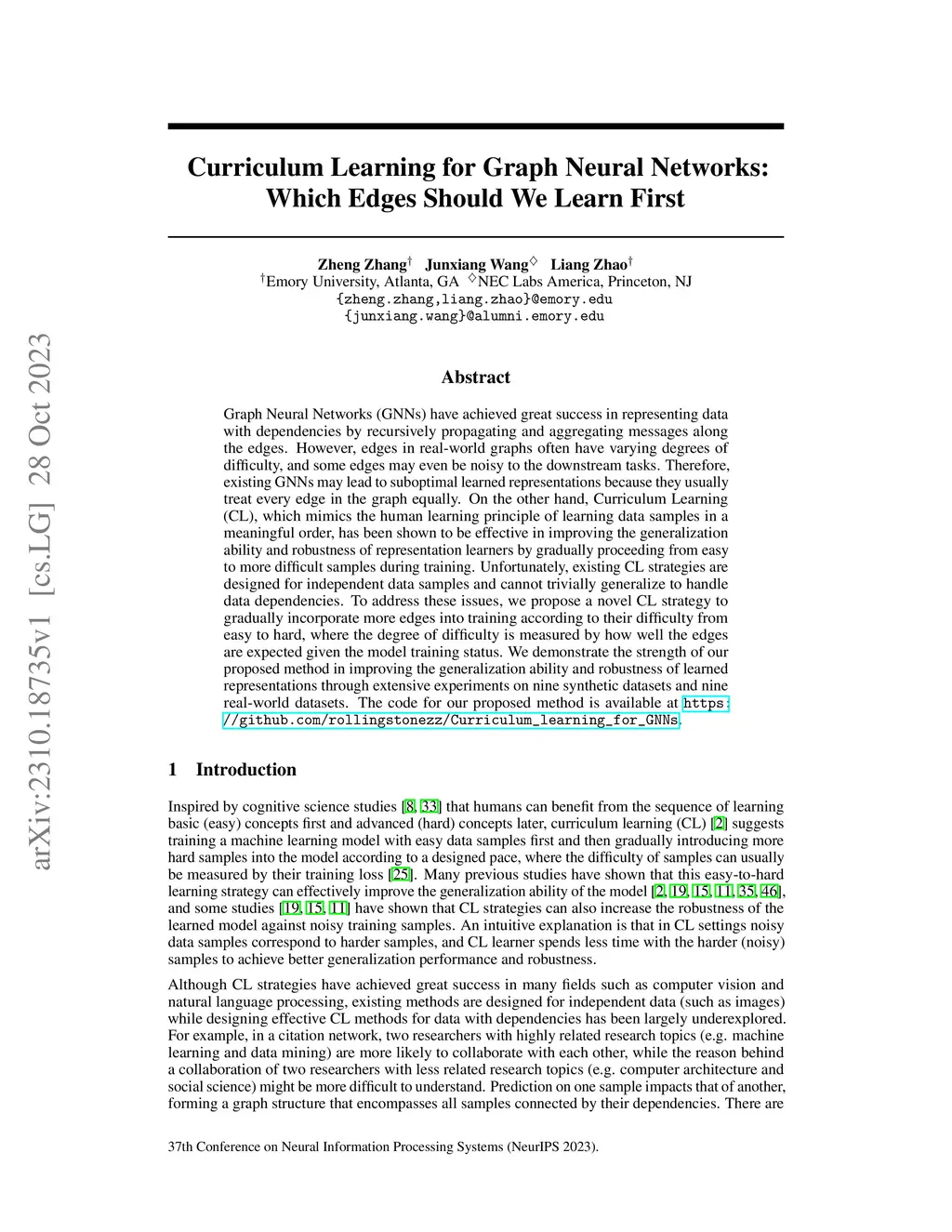 Graph Neural Networks (GNNs) have achieved great success in representing data with dependencies by recursively propagating and aggregating messages along the edges. However, edges in real-world graphs often have varying degrees of difficulty, and some edges may even be noisy to the downstream tasks. Therefore, existing GNNs may lead to suboptimal learned representations because they usually treat every edge in the graph equally. On the other hand, Curriculum Learning (CL), which mimics the human learning principle of learning data samples in a meaningful order, has been shown to be effective in improving the generalization ability and robustness of representation learners by gradually proceeding from easy to more difficult samples during training. Unfortunately, existing CL strategies are designed for independent data samples and cannot trivially generalize to handle data dependencies. To address these issues, we propose a novel CL strategy to gradually incorporate more edges into training according to their difficulty from easy to hard, where the degree of difficulty is measured by how well the edges are expected given the model training status. We demonstrate the strength of our proposed method in improving the generalization ability and robustness of learned representations through extensive experiments on nine synthetic datasets and nine real-world datasets. The code for our proposed method is available at https://github.com/rollingstonezz/Curriculum_learning_for_GNNs.