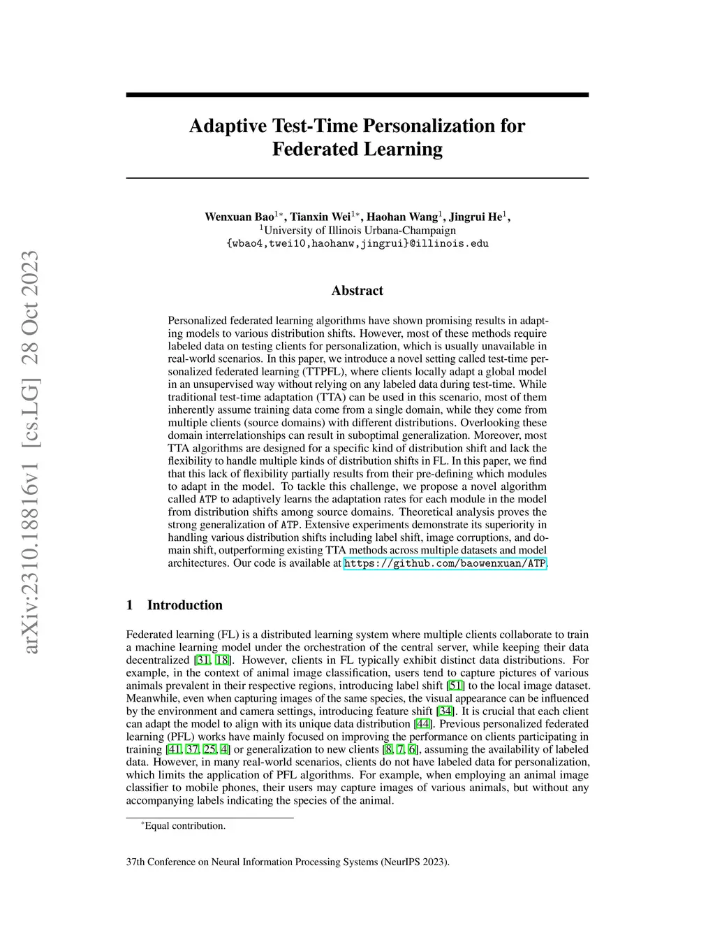 Personalized federated learning algorithms have shown promising results in adapting models to various distribution shifts. However, most of these methods require labeled data on testing clients for personalization, which is usually unavailable in real-world scenarios. In this paper, we introduce a novel setting called test-time personalized federated learning (TTPFL), where clients locally adapt a global model in an unsupervised way without relying on any labeled data during test-time. While traditional test-time adaptation (TTA) can be used in this scenario, most of them inherently assume training data come from a single domain, while they come from multiple clients (source domains) with different distributions. Overlooking these domain interrelationships can result in suboptimal generalization. Moreover, most TTA algorithms are designed for a specific kind of distribution shift and lack the flexibility to handle multiple kinds of distribution shifts in FL. In this paper, we find that this lack of flexibility partially results from their pre-defining which modules to adapt in the model. To tackle this challenge, we propose a novel algorithm called ATP to adaptively learns the adaptation rates for each module in the model from distribution shifts among source domains. Theoretical analysis proves the strong generalization of ATP. Extensive experiments demonstrate its superiority in handling various distribution shifts including label shift, image corruptions, and domain shift, outperforming existing TTA methods across multiple datasets and model architectures. Our code is available at https://github.com/baowenxuan/ATP .