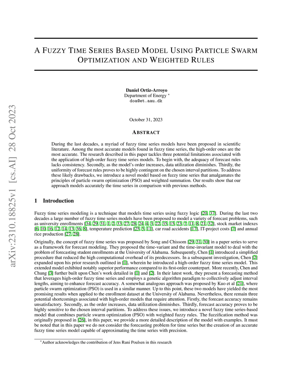 During the last decades, a myriad of fuzzy time series models have been proposed in scientific literature. Among the most accurate models found in fuzzy time series, the high-order ones are the most accurate. The research described in this paper tackles three potential limitations associated with the application of high-order fuzzy time series models. To begin with, the adequacy of forecast rules lacks consistency. Secondly, as the model's order increases, data utilization diminishes. Thirdly, the uniformity of forecast rules proves to be highly contingent on the chosen interval partitions. To address these likely drawbacks, we introduce a novel model based on fuzzy time series that amalgamates the principles of particle swarm optimization (PSO) and weighted summation. Our results show that our approach models accurately the time series in comparison with previous methods.