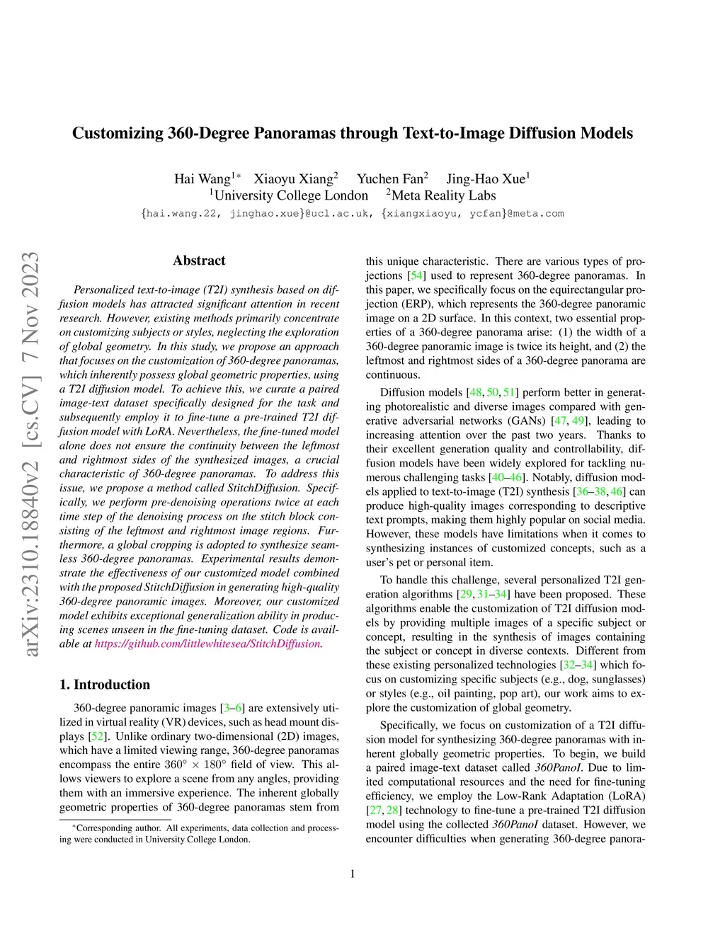 Personalized text-to-image (T2I) synthesis based on diffusion models has attracted significant attention in recent research. However, existing methods primarily concentrate on customizing subjects or styles, neglecting the exploration of global geometry. In this study, we propose an approach that focuses on the customization of 360-degree panoramas, which inherently possess global geometric properties, using a T2I diffusion model. To achieve this, we curate a paired image-text dataset specifically designed for the task and subsequently employ it to fine-tune a pre-trained T2I diffusion model with LoRA. Nevertheless, the fine-tuned model alone does not ensure the continuity between the leftmost and rightmost sides of the synthesized images, a crucial characteristic of 360-degree panoramas. To address this issue, we propose a method called StitchDiffusion. Specifically, we perform pre-denoising operations twice at each time step of the denoising process on the stitch block consisting of the leftmost and rightmost image regions. Furthermore, a global cropping is adopted to synthesize seamless 360-degree panoramas. Experimental results demonstrate the effectiveness of our customized model combined with the proposed StitchDiffusion in generating high-quality 360-degree panoramic images. Moreover, our customized model exhibits exceptional generalization ability in producing scenes unseen in the fine-tuning dataset. Code is available at https://github.com/littlewhitesea/StitchDiffusion.