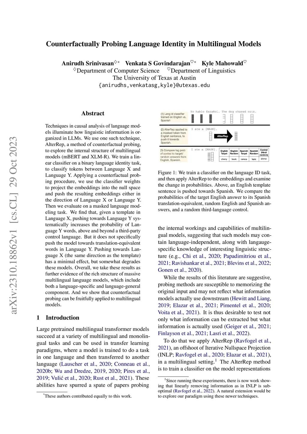 Techniques in causal analysis of language models illuminate how linguistic information is organized in LLMs. We use one such technique, AlterRep, a method of counterfactual probing, to explore the internal structure of multilingual models (mBERT and XLM-R). We train a linear classifier on a binary language identity task, to classify tokens between Language X and Language Y. Applying a counterfactual probing procedure, we use the classifier weights to project the embeddings into the null space and push the resulting embeddings either in the direction of Language X or Language Y. Then we evaluate on a masked language modeling task. We find that, given a template in Language X, pushing towards Language Y systematically increases the probability of Language Y words, above and beyond a third-party control language. But it does not specifically push the model towards translation-equivalent words in Language Y. Pushing towards Language X (the same direction as the template) has a minimal effect, but somewhat degrades these models. Overall, we take these results as further evidence of the rich structure of massive multilingual language models, which include both a language-specific and language-general component. And we show that counterfactual probing can be fruitfully applied to multilingual models.