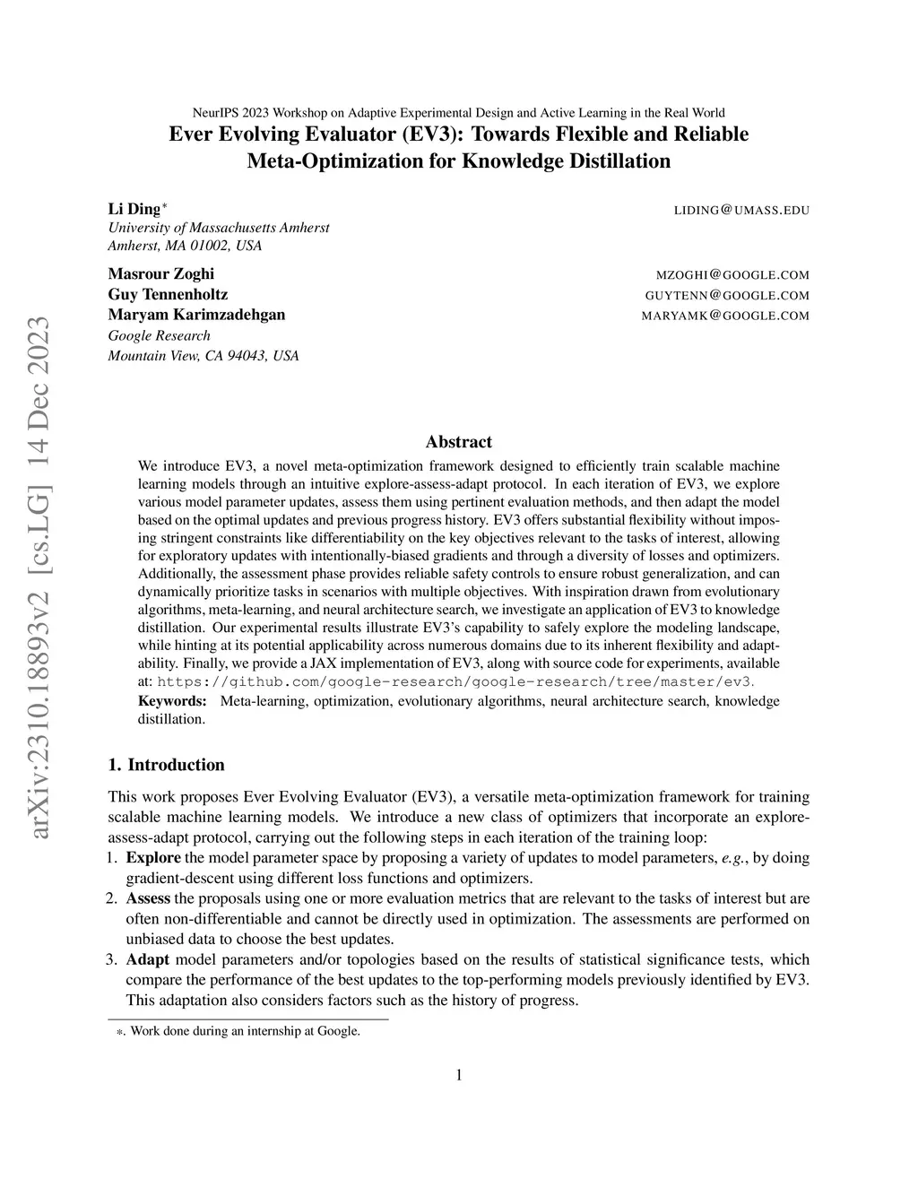 We introduce EV3, a novel meta-optimization framework designed to efficiently train scalable machine learning models through an intuitive explore-assess-adapt protocol. In each iteration of EV3, we explore various model parameter updates, assess them using pertinent evaluation methods, and then adapt the model based on the optimal updates and previous progress history. EV3 offers substantial flexibility without imposing stringent constraints like differentiability on the key objectives relevant to the tasks of interest, allowing for exploratory updates with intentionally-biased gradients and through a diversity of losses and optimizers. Additionally, the assessment phase provides reliable safety controls to ensure robust generalization, and can dynamically prioritize tasks in scenarios with multiple objectives. With inspiration drawn from evolutionary algorithms, meta-learning, and neural architecture search, we investigate an application of EV3 to knowledge distillation. Our experimental results illustrate EV3's capability to safely explore the modeling landscape, while hinting at its potential applicability across numerous domains due to its inherent flexibility and adaptability. Finally, we provide a JAX implementation of EV3, along with source code for experiments, available at: https://github.com/google-research/google-research/tree/master/ev3.