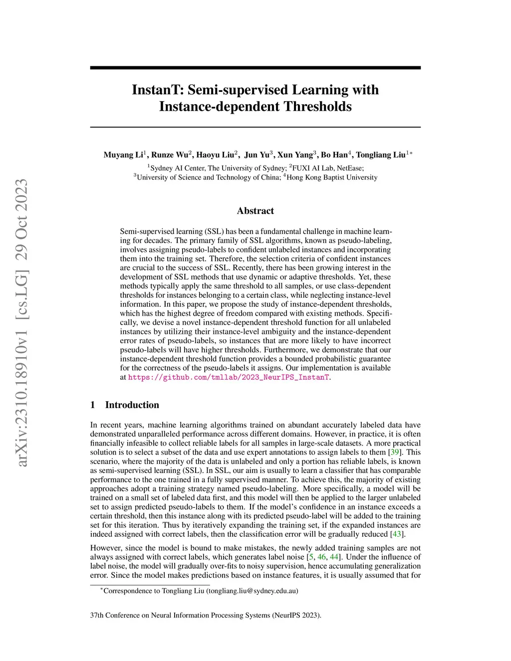 InstanT: Semi-supervised Learning with Instance-dependent Thresholds