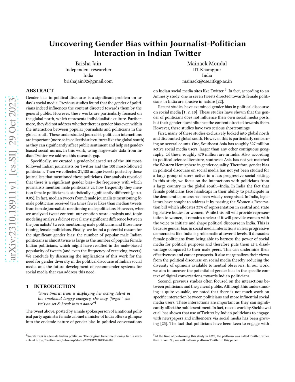 Gender bias in political discourse is a significant problem on today's social media. Previous studies found that the gender of politicians indeed influences the content directed towards them by the general public. However, these works are particularly focused on the global north, which represents individualistic culture. Furthermore, they did not address whether there is gender bias even within the interaction between popular journalists and politicians in the global south. These understudied journalist-politician interactions are important (more so in collectivistic cultures like the global south) as they can significantly affect public sentiment and help set gender-biased social norms. In this work, using large-scale data from Indian Twitter we address this research gap. We curated a gender-balanced set of 100 most-followed Indian journalists on Twitter and 100 most-followed politicians. Then we collected 21,188 unique tweets posted by these journalists that mentioned these politicians. Our analysis revealed that there is a significant gender bias -- the frequency with which journalists mention male politicians vs. how frequently they mention female politicians is statistically significantly different (). In fact, median tweets from female journalists mentioning female politicians received ten times fewer likes than median tweets from female journalists mentioning male politicians. However, when we analyzed tweet content, our emotion score analysis and topic modeling analysis did not reveal any significant gender-based difference within the journalists' tweets towards politicians. Finally, we found a potential reason for the significant gender bias: the number of popular male Indian politicians is almost twice as large as the number of popular female Indian politicians, which might have resulted in the observed bias. We conclude by discussing the implications of this work.